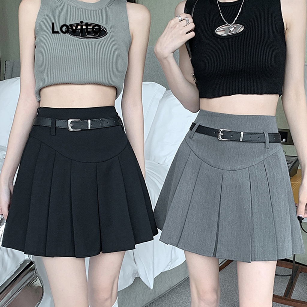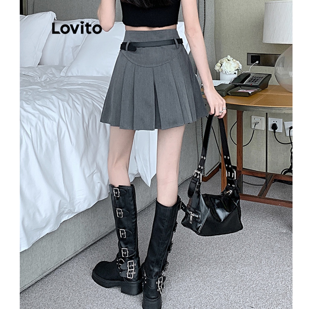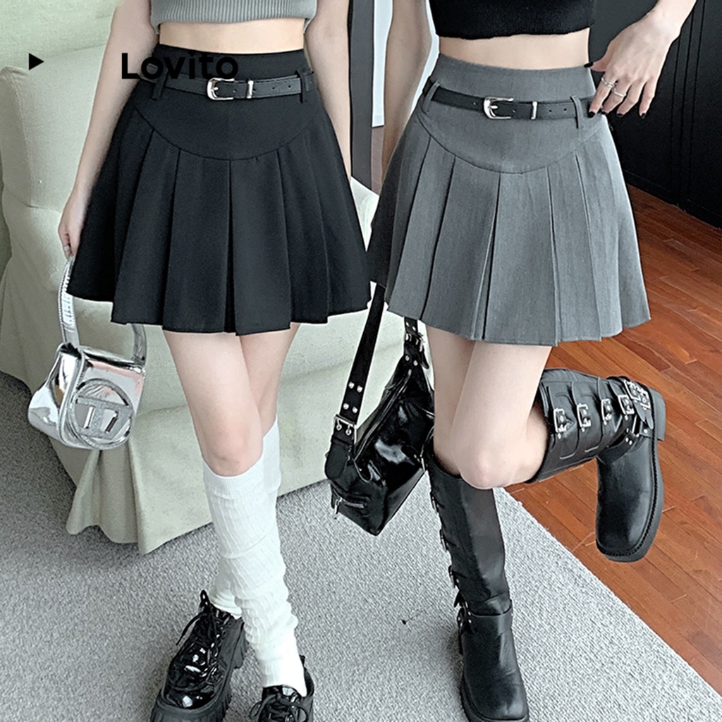 Lovito váy xếp ly dây rút màu trơn thường ngày cho Nữ lne30034 (Xám/Trắng nhạt/Đen)