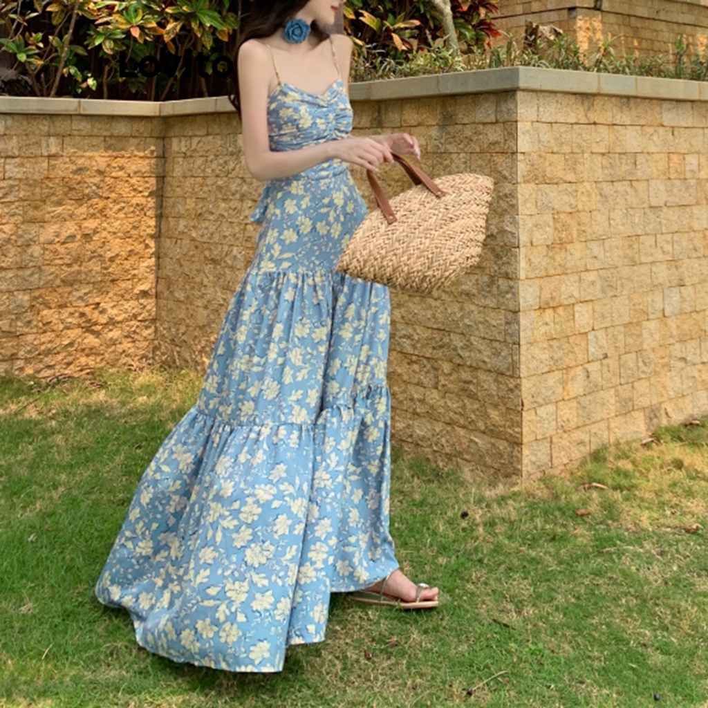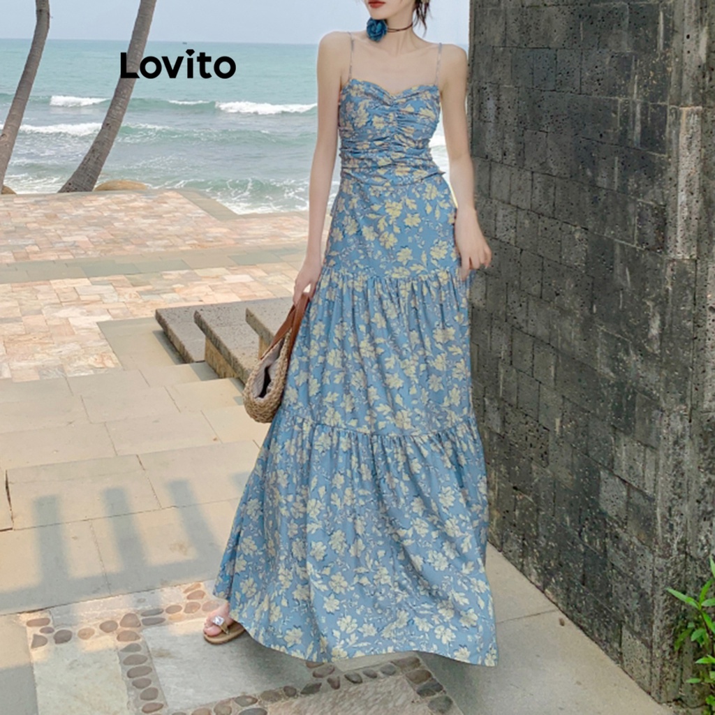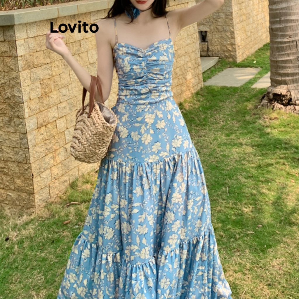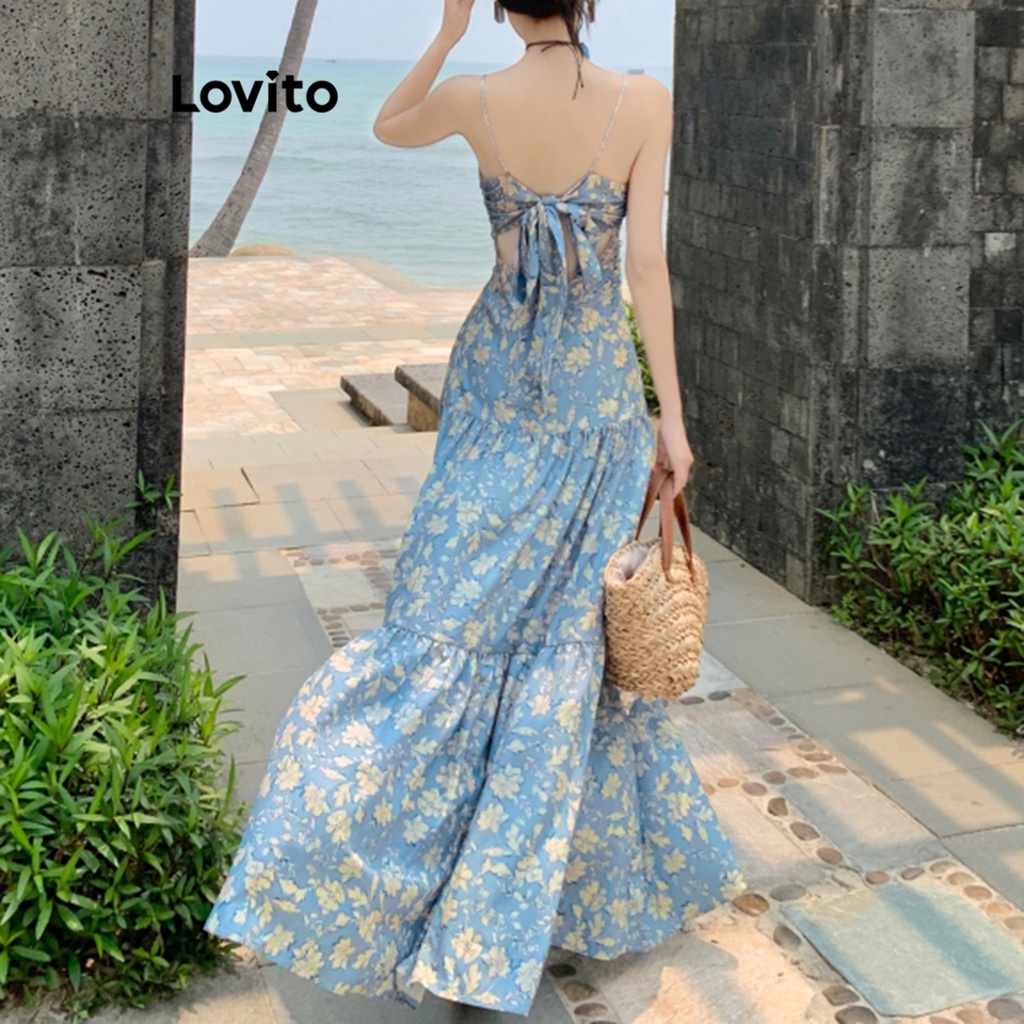 Lovito Đầm nữ dải băng phía trước hở hoa nhỏ thường ngày l56ed110 (màu xanh dương)