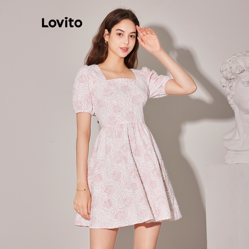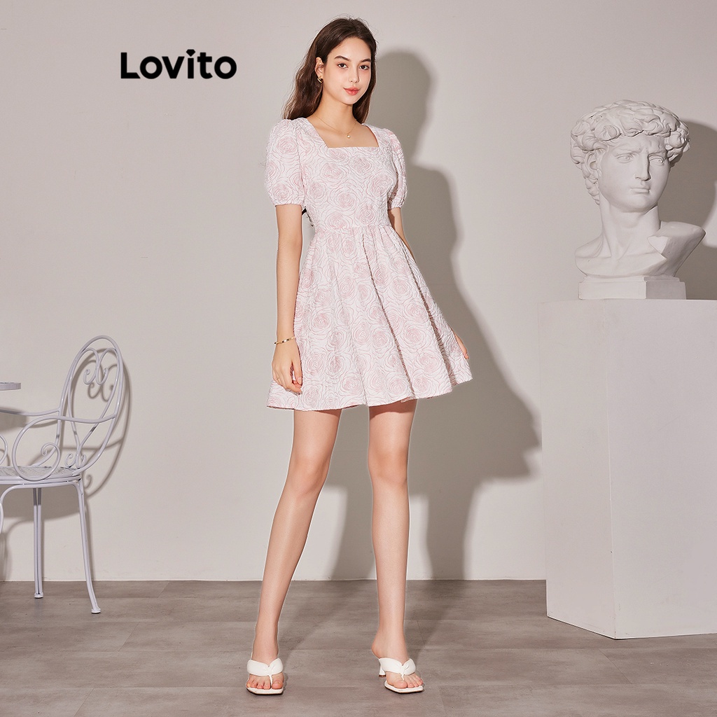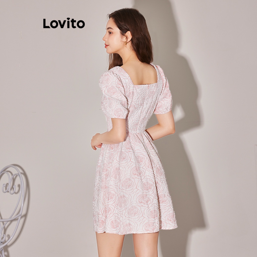 Lovito Đầm tay đèn lồng nhún bèo thêu hoa thường ngày cho Nữ lne02061 (Màu Trắng)