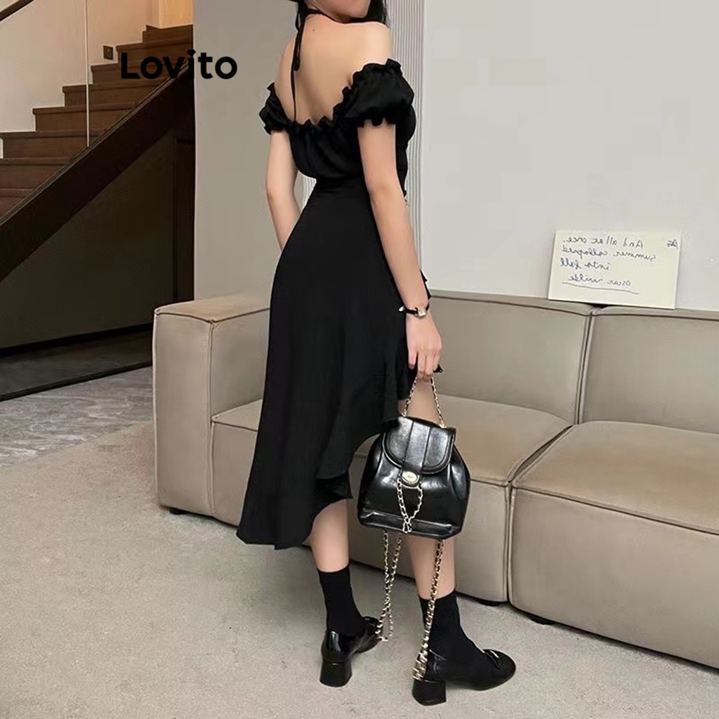 Lovito Đầm xếp ly dây buộc cho nữ ĐẦM BOHO khối màu hở lưng l79ad085