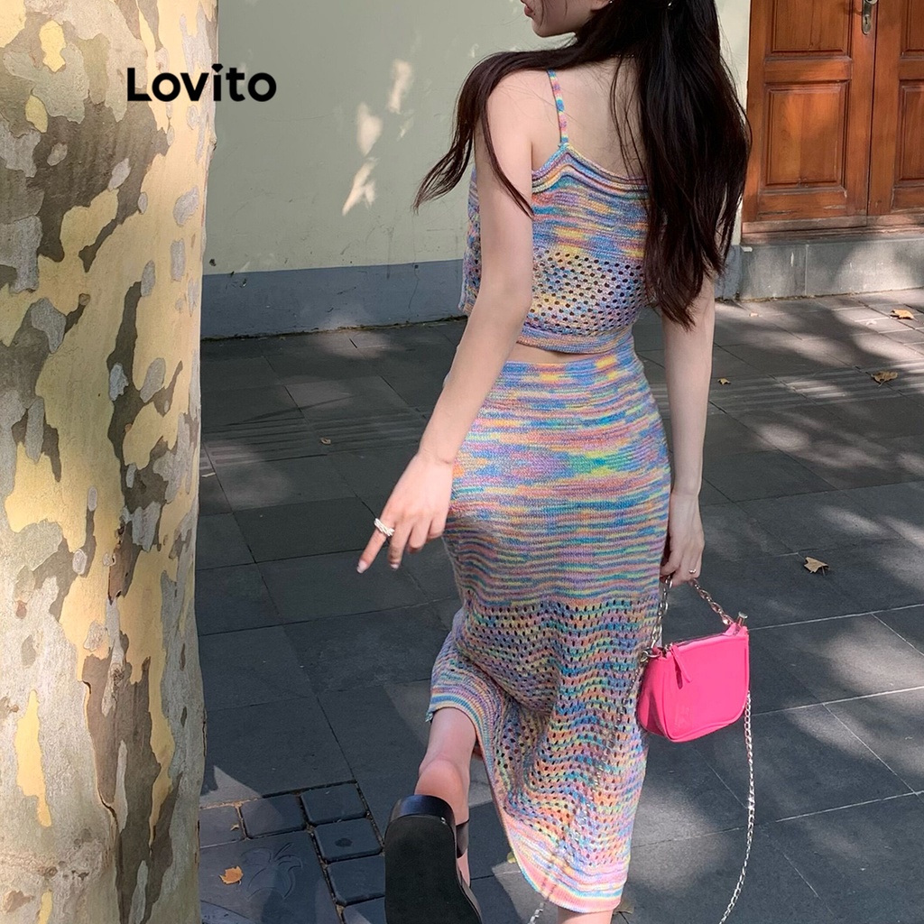 Lovito bộ quần đùi không tay chắp vá cạp cao dây mảnh phong cách lãng mạn l35ld081 (màu xanh dương)