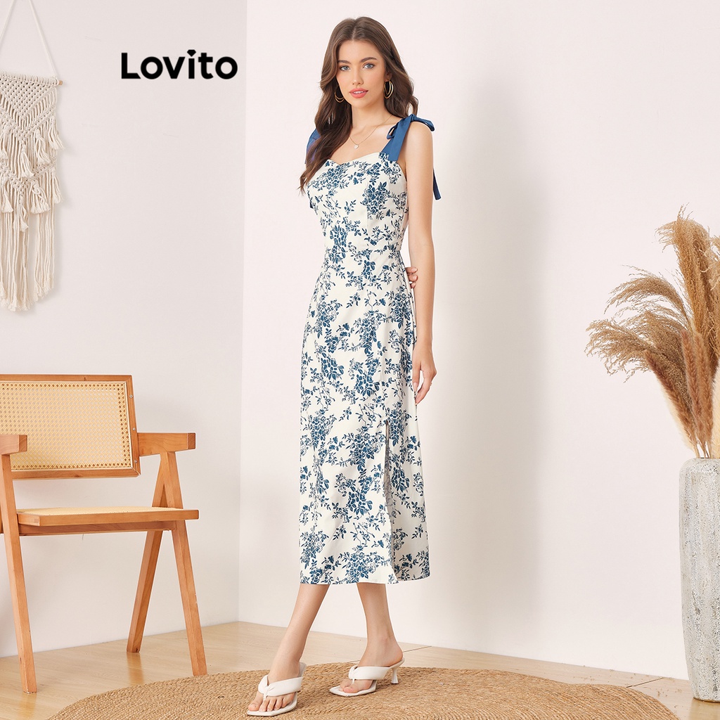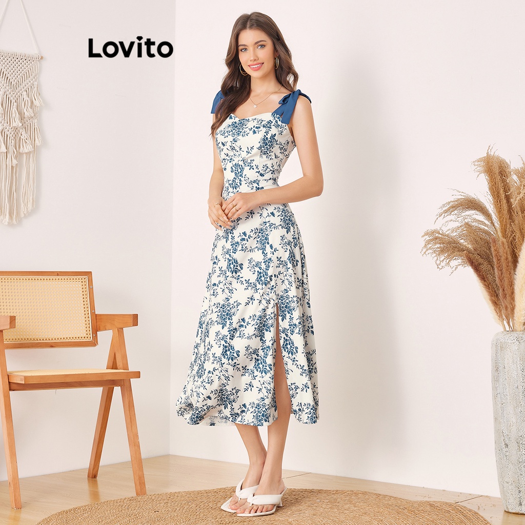Lovito Đầm hoa cắt dây kéo phong cách thường ngày cho Nữ l55ad054 (Xanh nhạt)