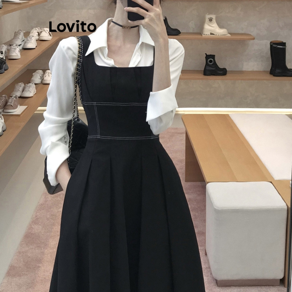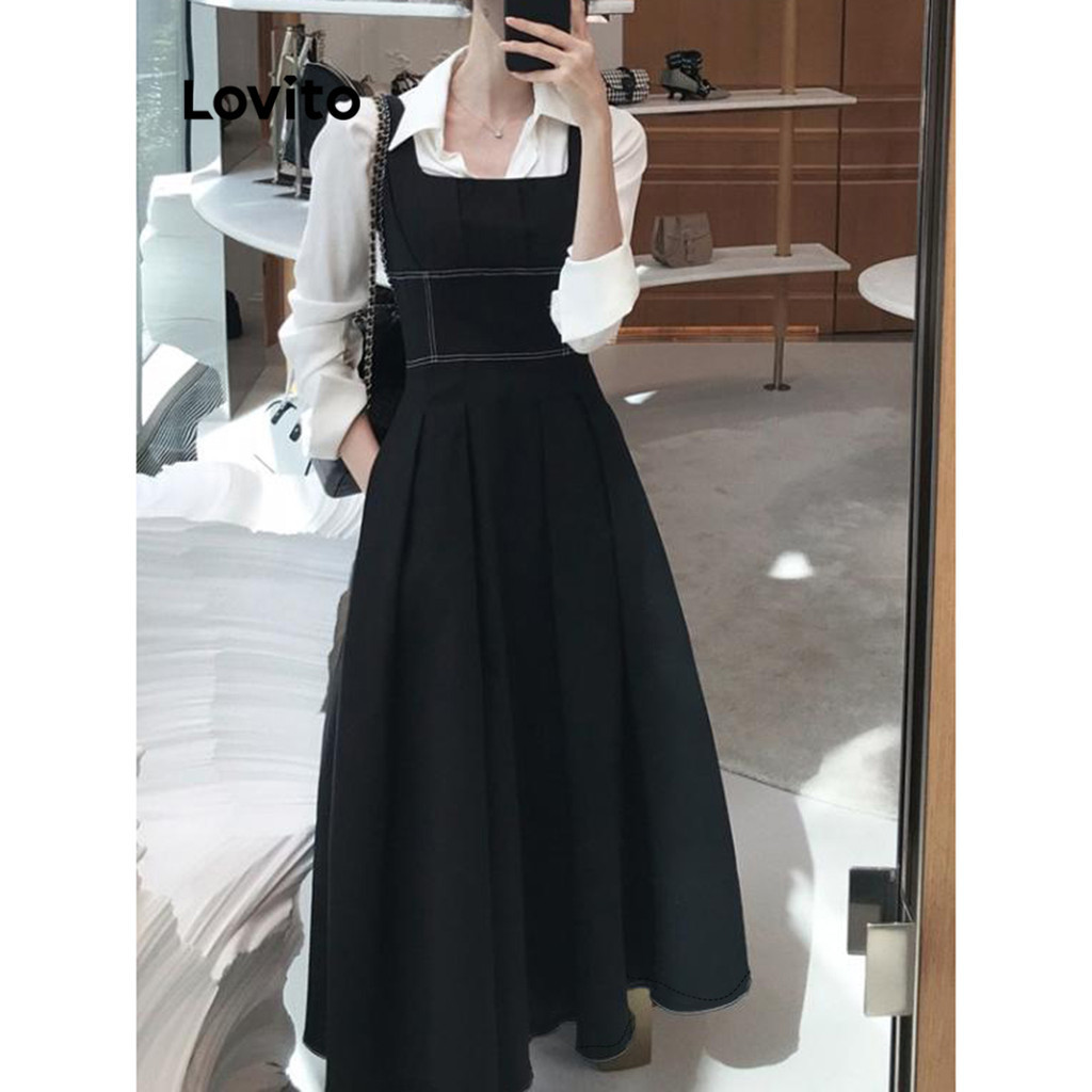 Lovito Đầm không đều xẻ viền bất đối xứng màu trơn thường ngày cho Nữ lne21271 (Màu Đen)