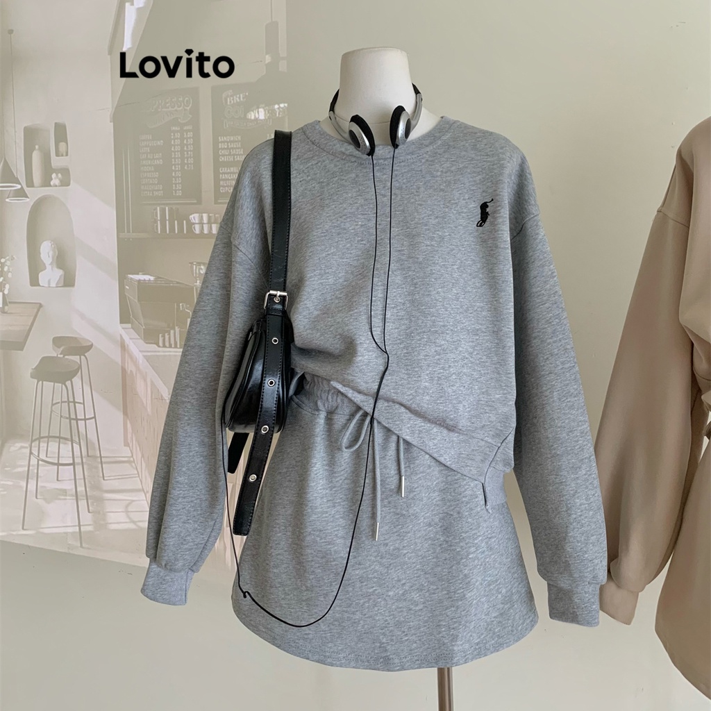 Lovito bộ quần đùi nữ tay ngắn khóa kéo in chữ phong cách thường ngày lne05193 (Màu Xám)