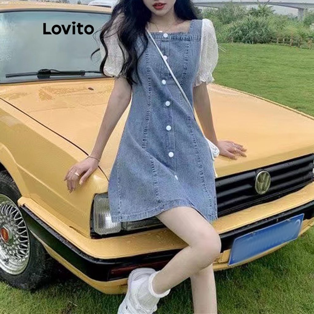 Lovito Đầm tay phồng nút màu tương phản phong cách thường ngày cho Nữ lne19053 (Nhiều màu)