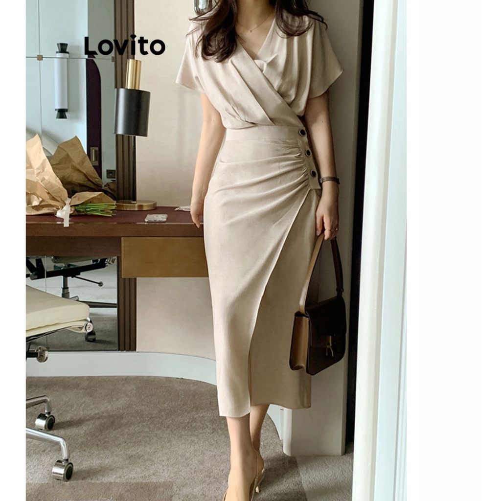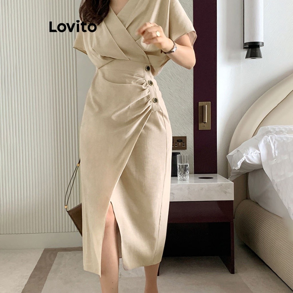 Lovito Đầm xếp ly tay bèo nhún buộc dây thường ngày cho Nữ lne16026 (Nhiều màu)