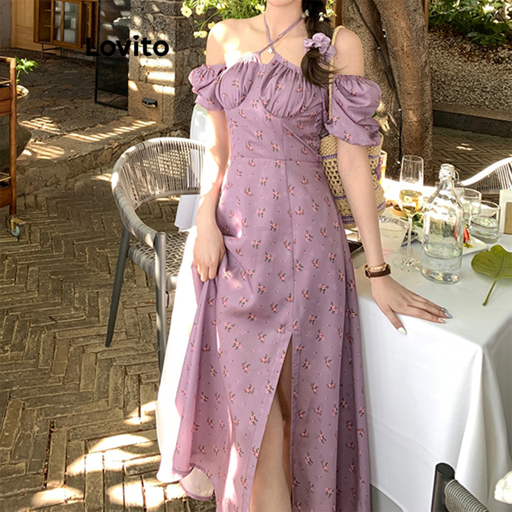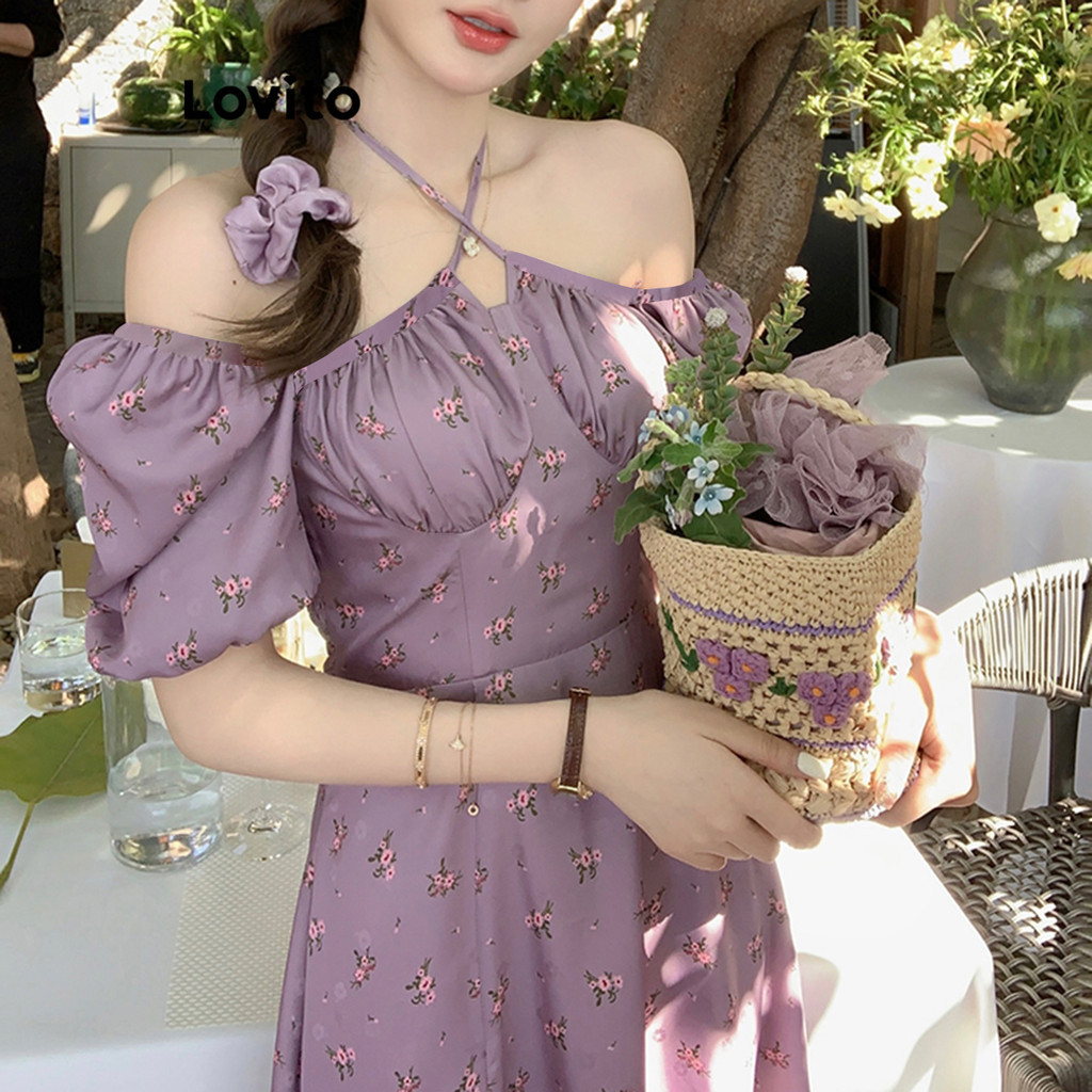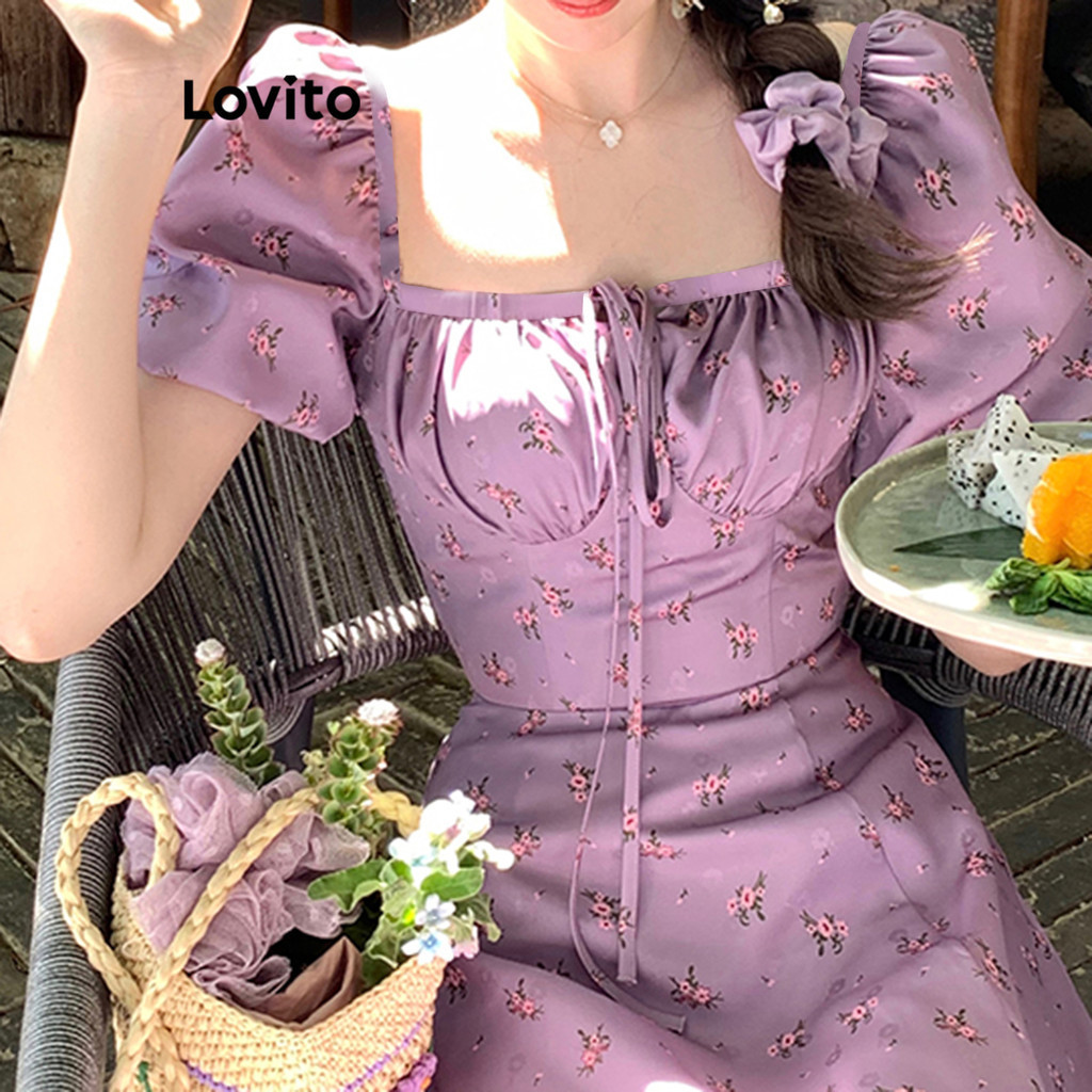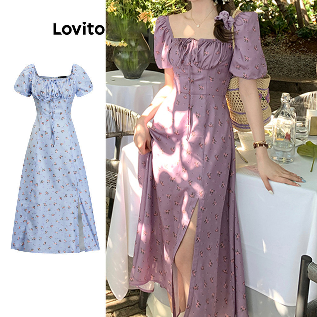 Lovito Đầm nữ dải băng phía trước hở hoa nhỏ thường ngày l56ed110 (màu xanh dương)