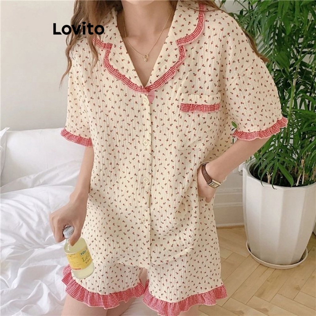 Lovito lna27252 Áo ngủ xếp ly ren hoa cúc thường ngày đồ ngủ nữ (Hoa mai)
