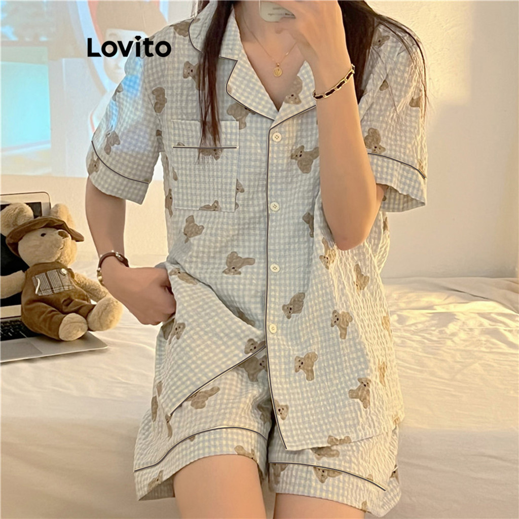 Lovito Bộ đồ ngủ nữ tay ngắn cổ kẻ ca rô có túi viền màu thường ngày lna12022 (Màu Trắng)