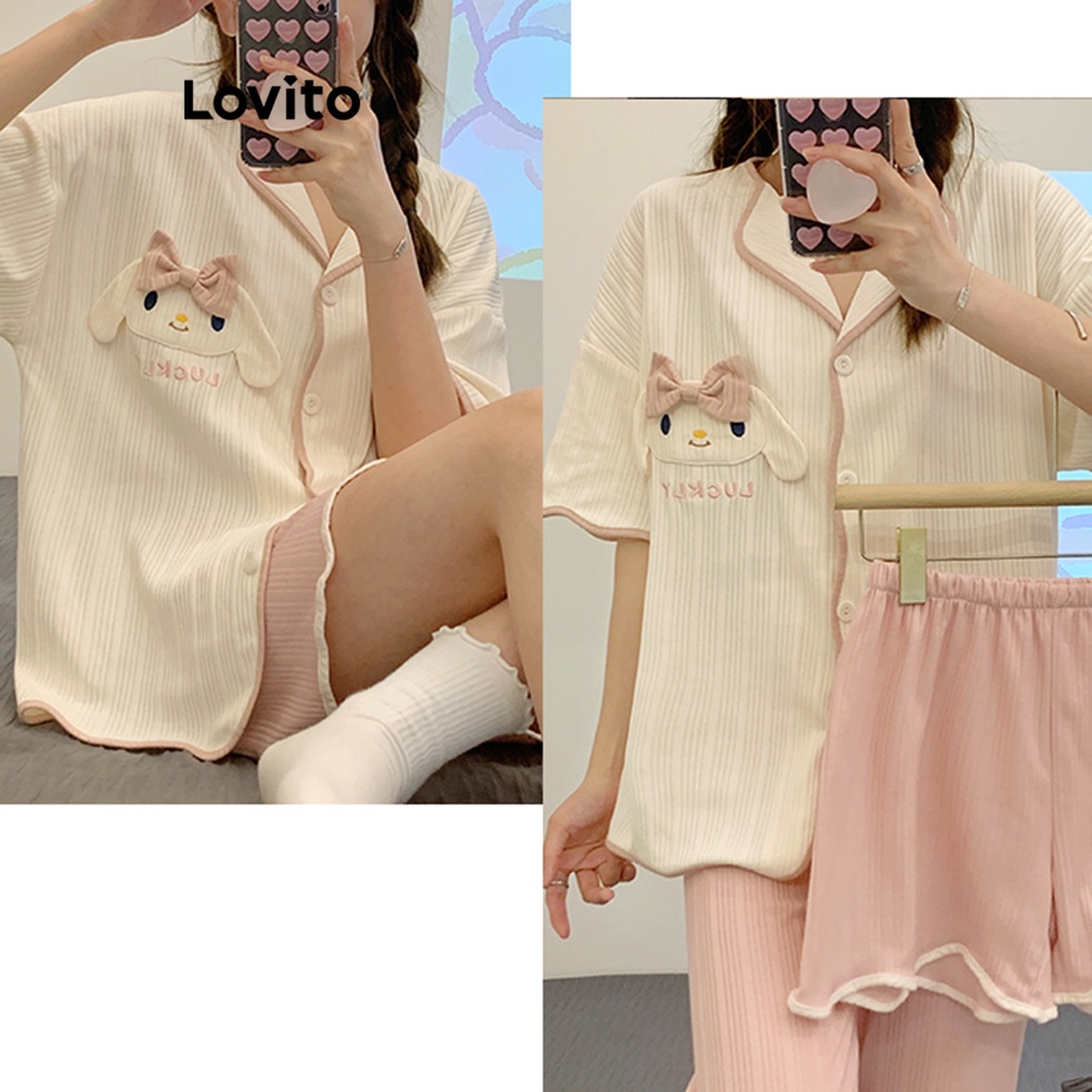 Lovito Đồ ngủ phong cách hoạt hình thường ngày có túi cài khuy phía trước ren cho nữ lna27255 (Màu Trắng)