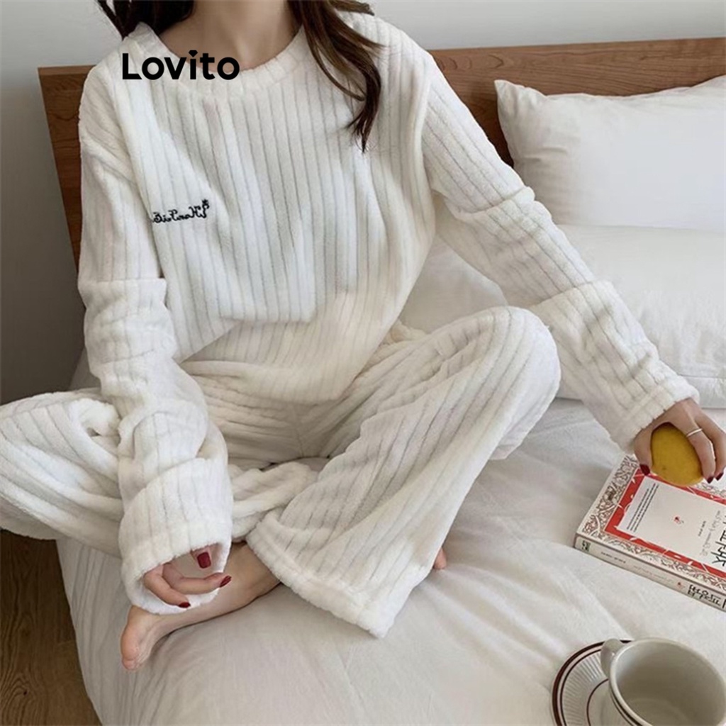 Lovito Đồ ngủ phong cách hoạt hình thường ngày có túi cài khuy phía trước ren cho nữ lna27255 (Màu Trắng)