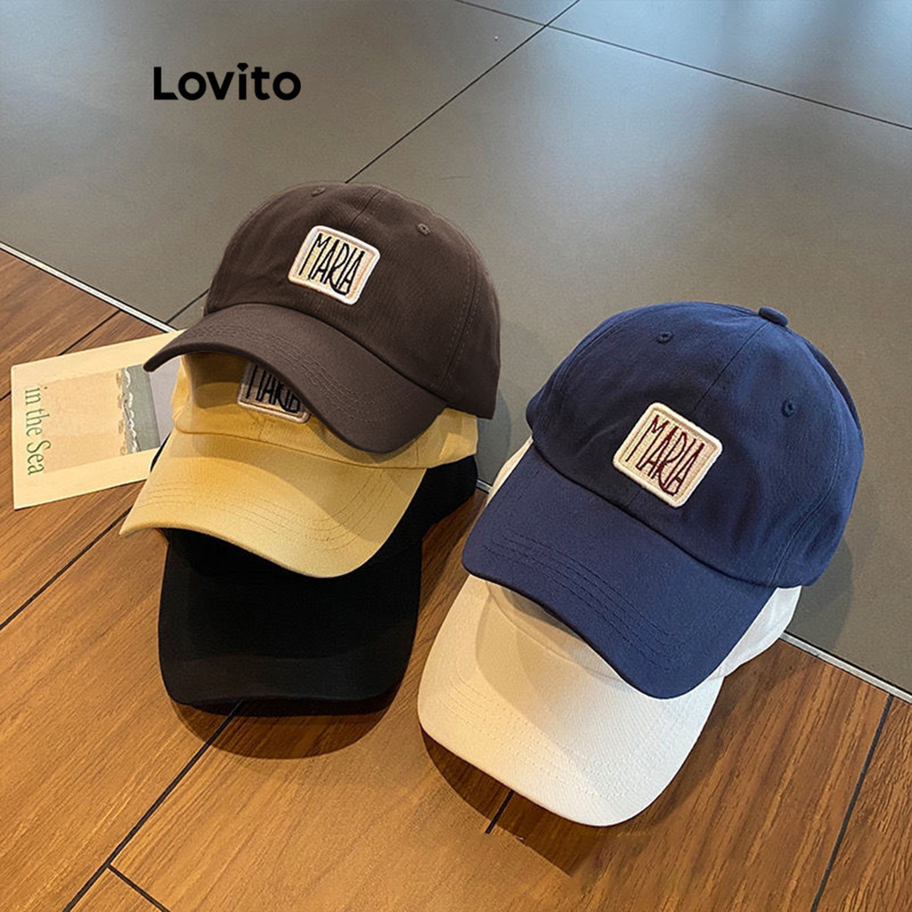 Lovito lfa08598 Mũ nữ kiểu Mỹ retro thêu chữ phong cách thường ngày màu khối (Nâu/trắng/hồng/xanh lá/Đen)