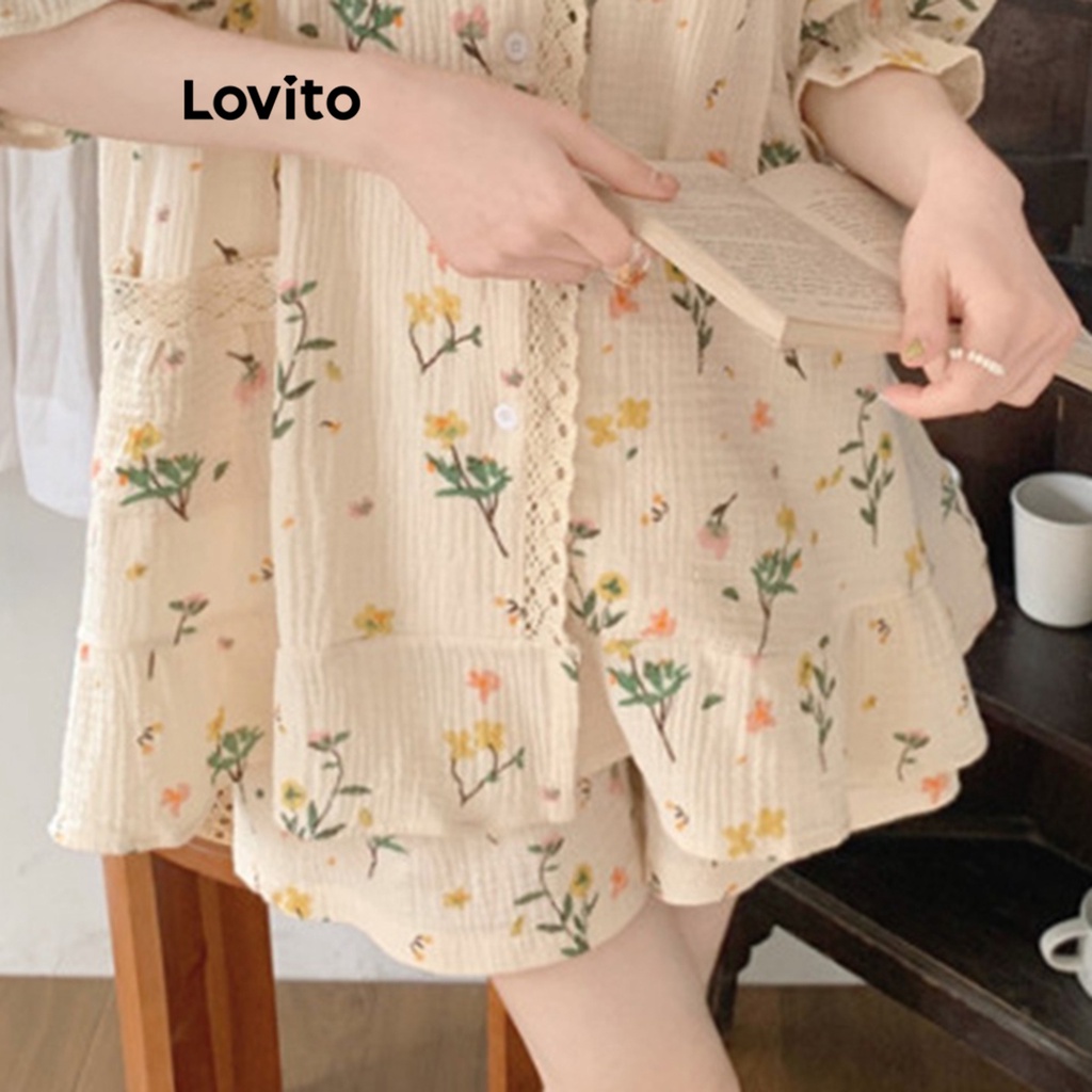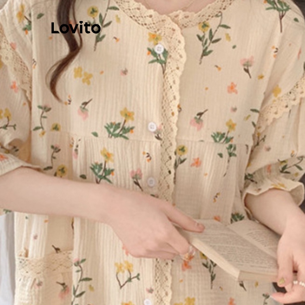 Lovito đồ ngủ nữ cổ áo cài khuy trước có túi hoa cúc thường ngày lna27253 (Tím/Đỏ/Xanh dương)