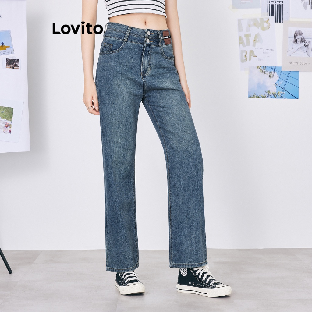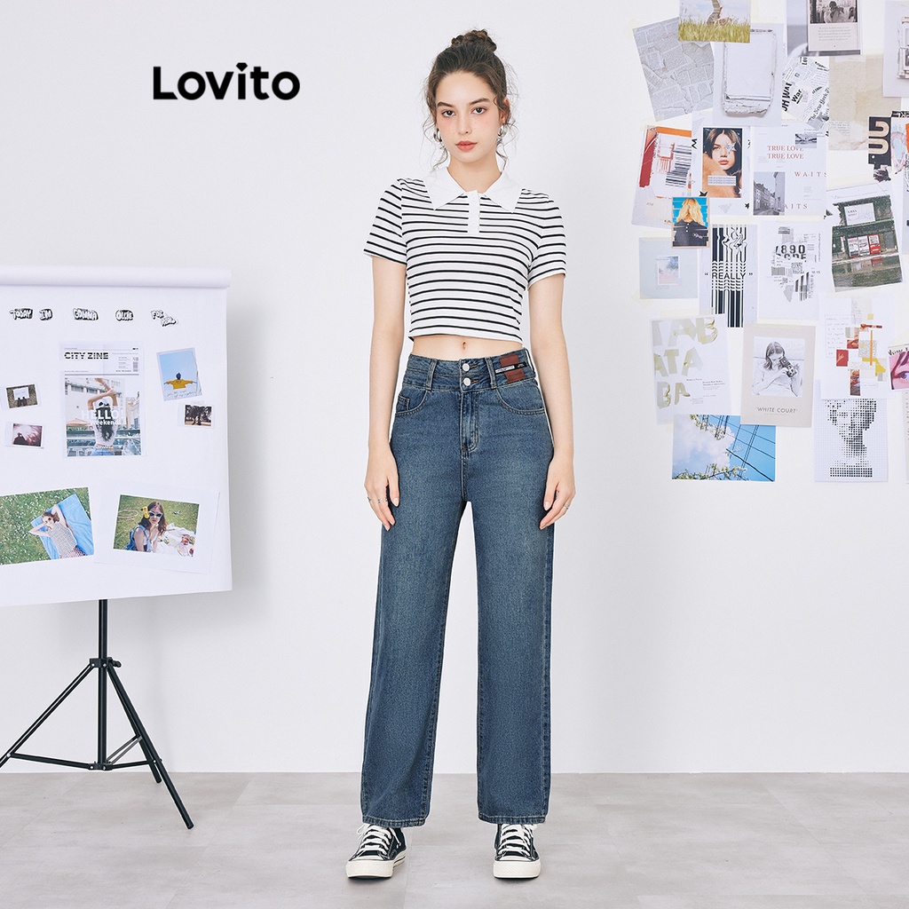 Lovito Quần bò nữ ống rộng cạp cao hình chữ V đơn giản l47ed146 (Nhiều màu)