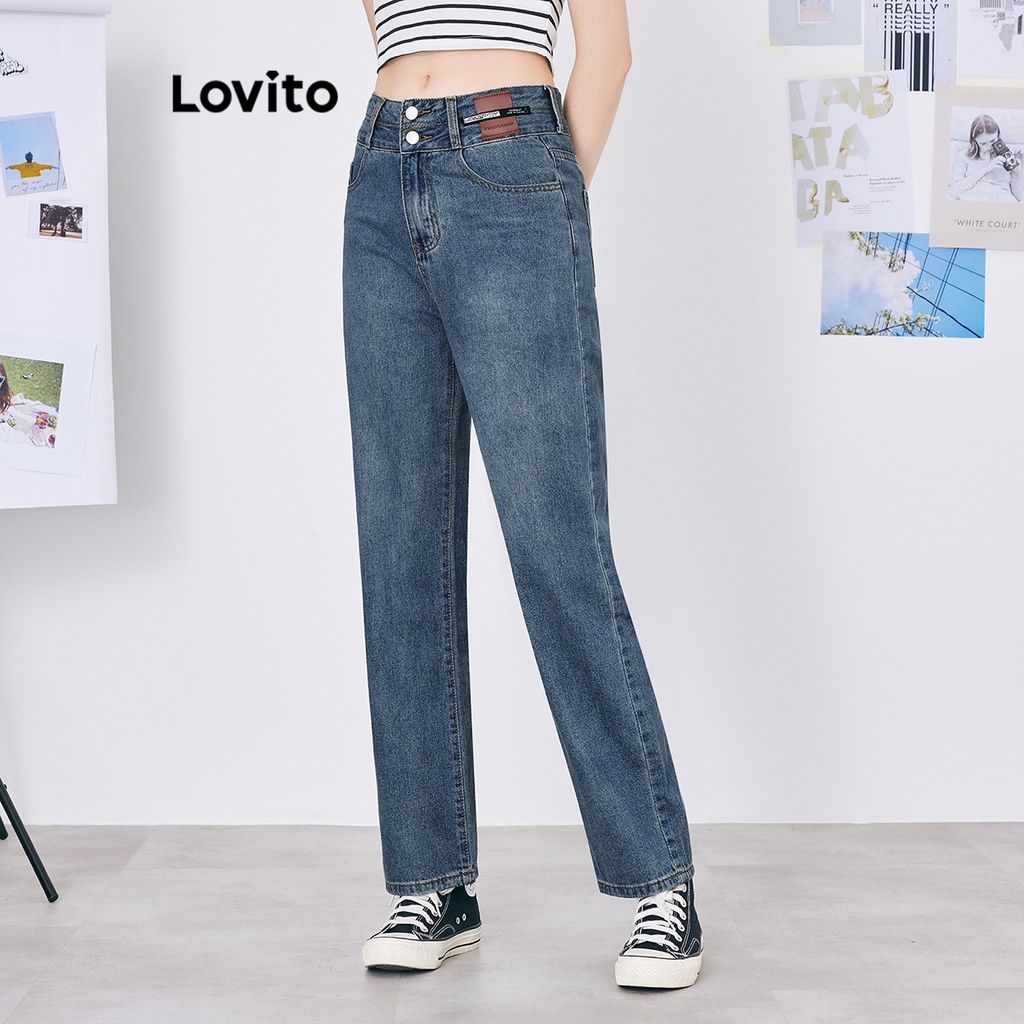 Lovito Quần bò nữ cạp cao thêu chữ cổ điển l35ad070 (màu xanh dương)