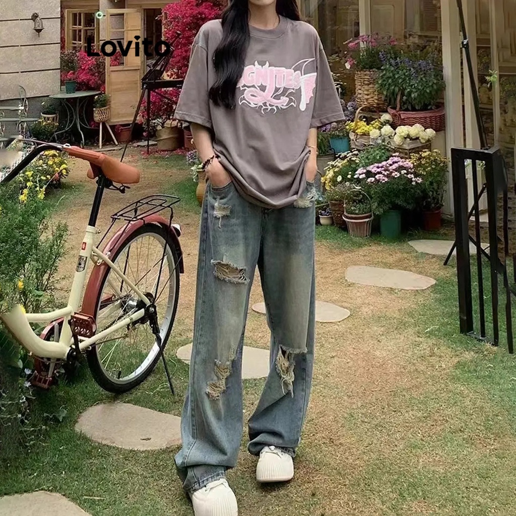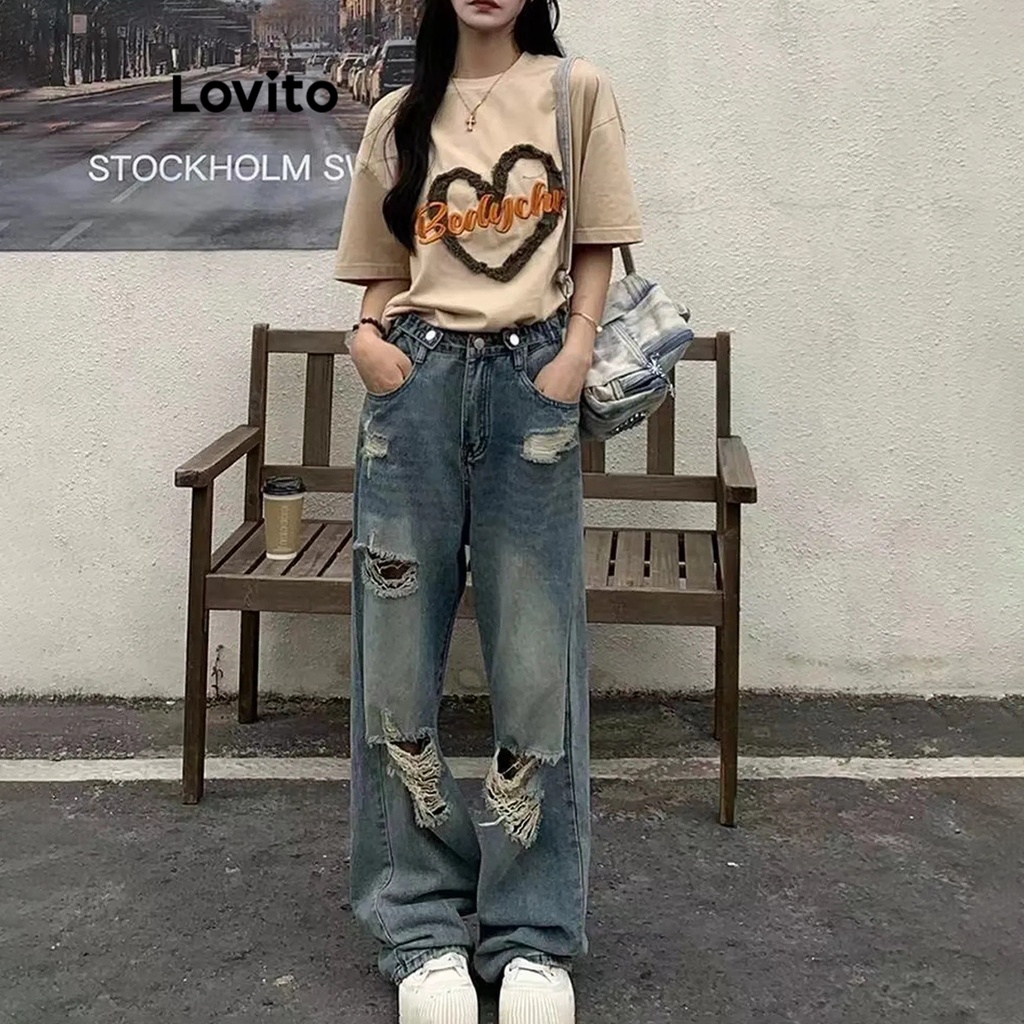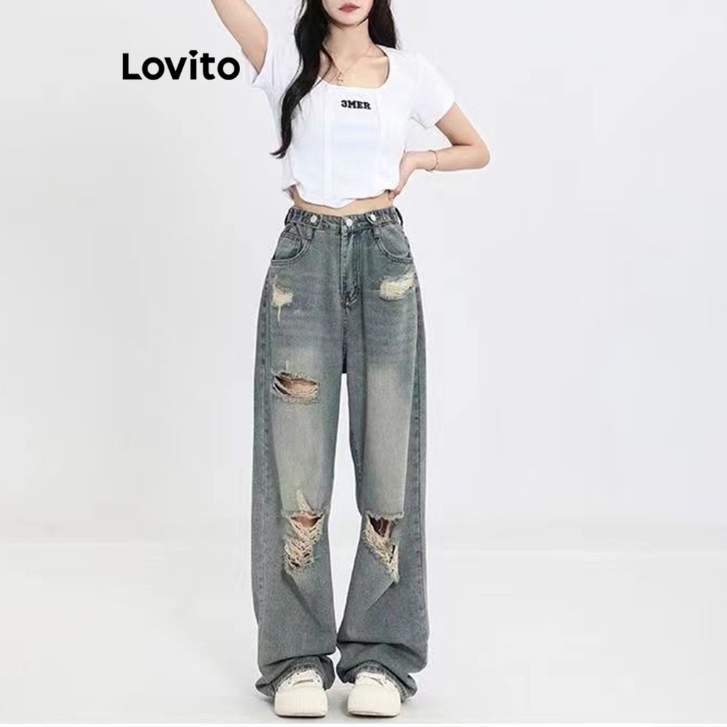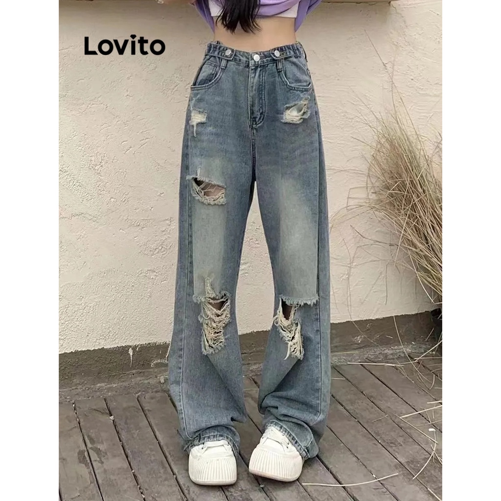 Lovito Quần bò nữ ống rộng cạp cao hình chữ V đơn giản l47ed146 (Nhiều màu)