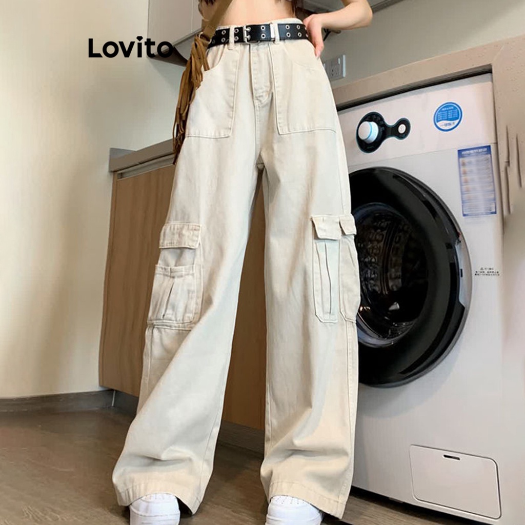 Lovito Quần bò nữ ống rộng cạp cao hình chữ V đơn giản l47ed146 (Nhiều màu)