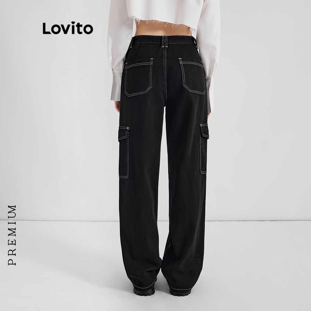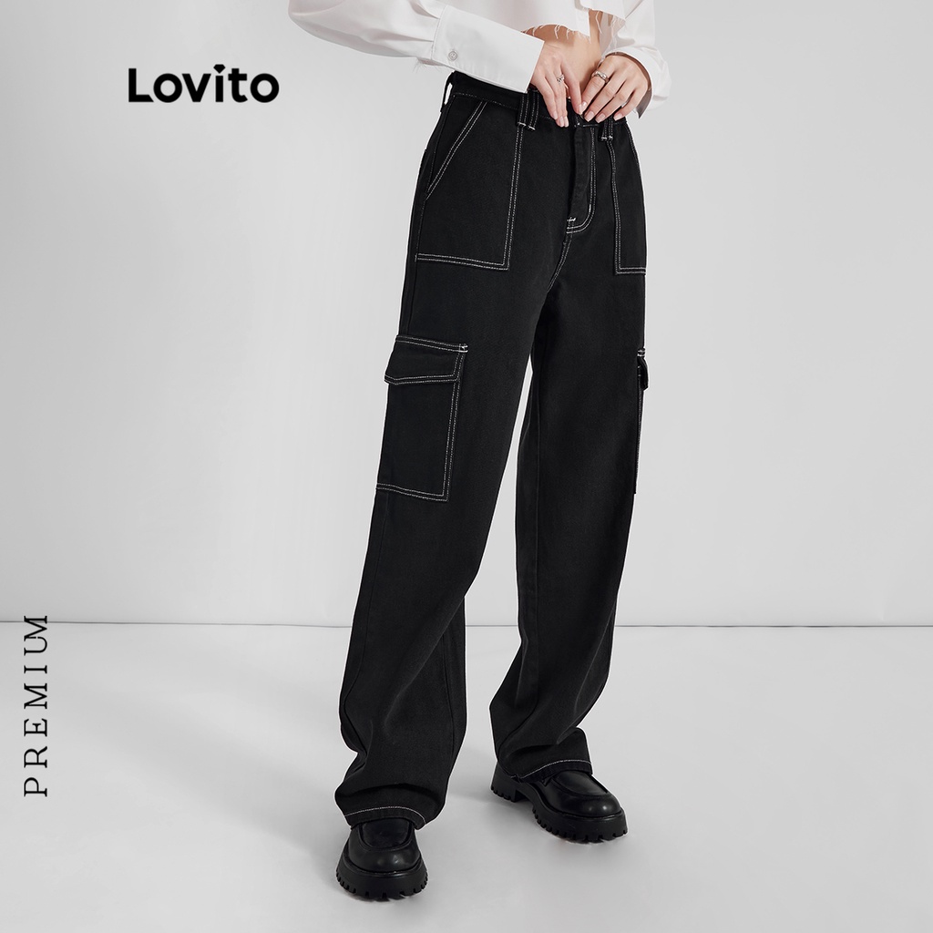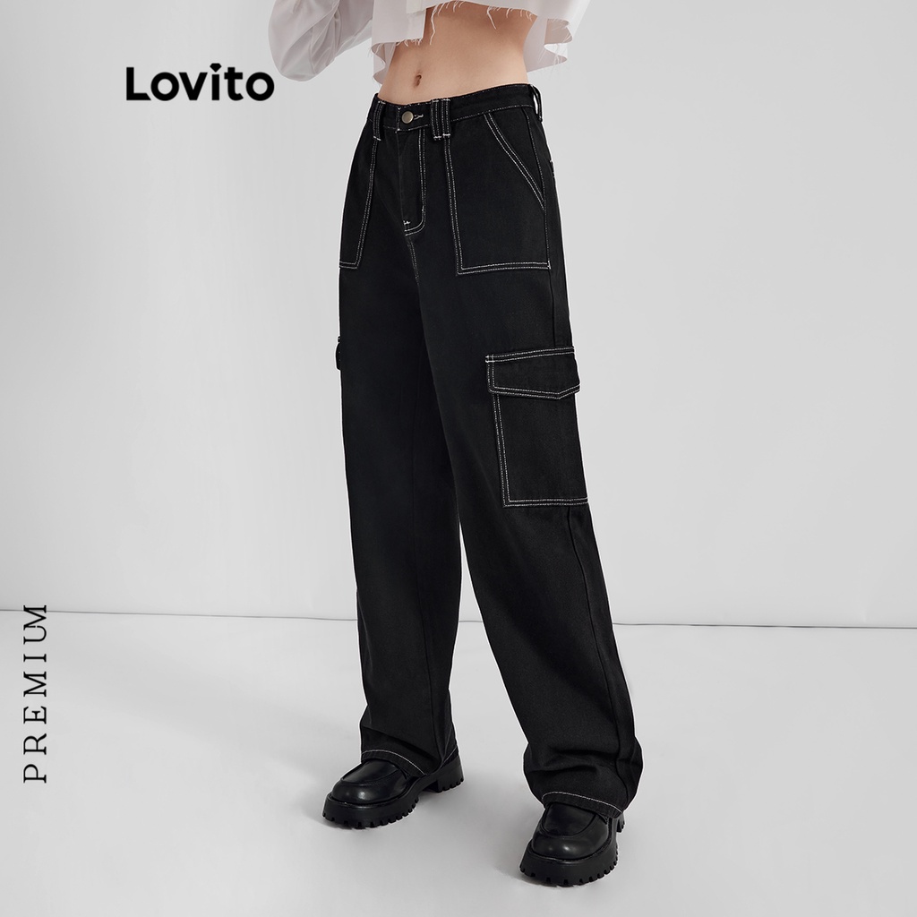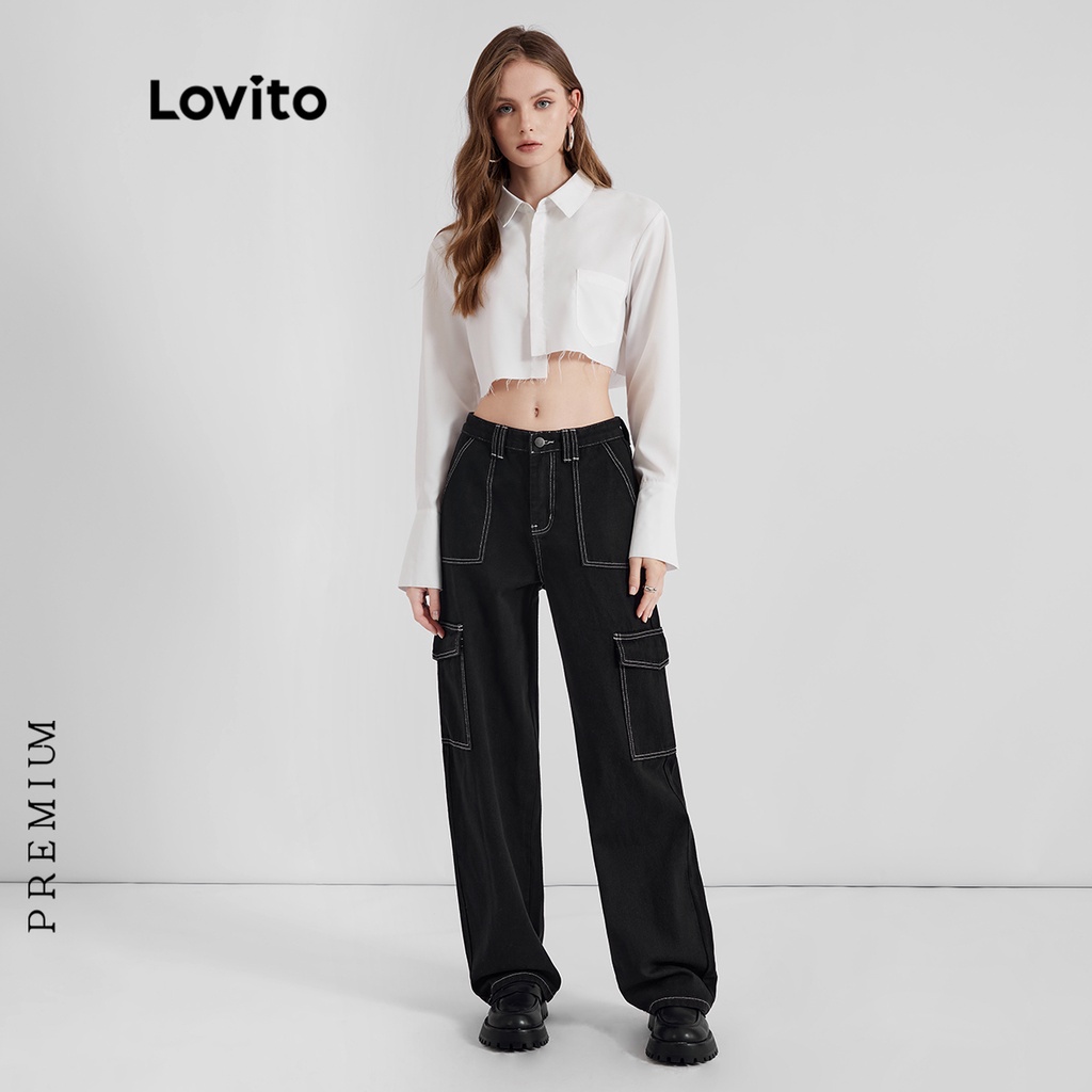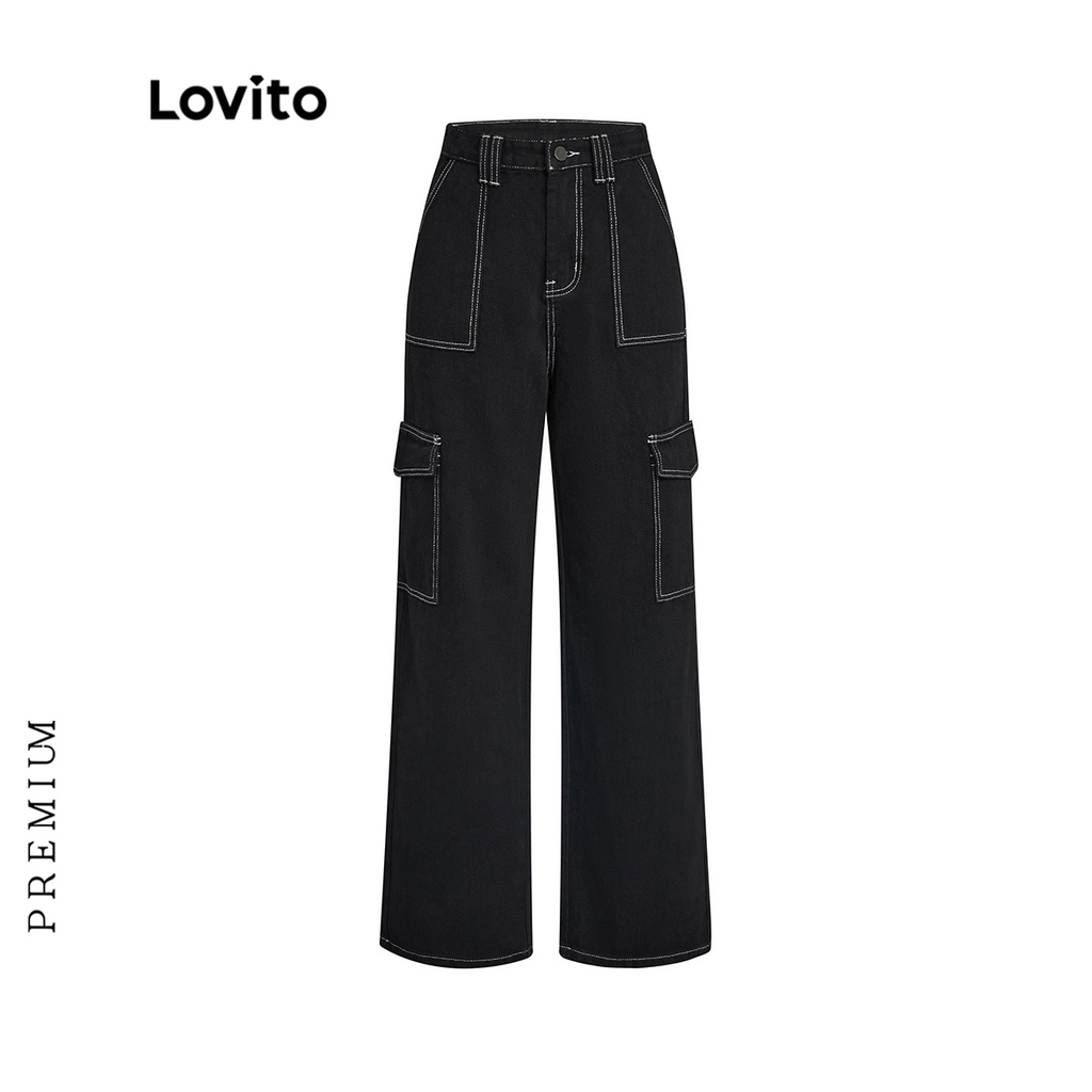 Lovito Quần bò nữ ống rộng cạp cao hình chữ V đơn giản l47ed146 (Nhiều màu)