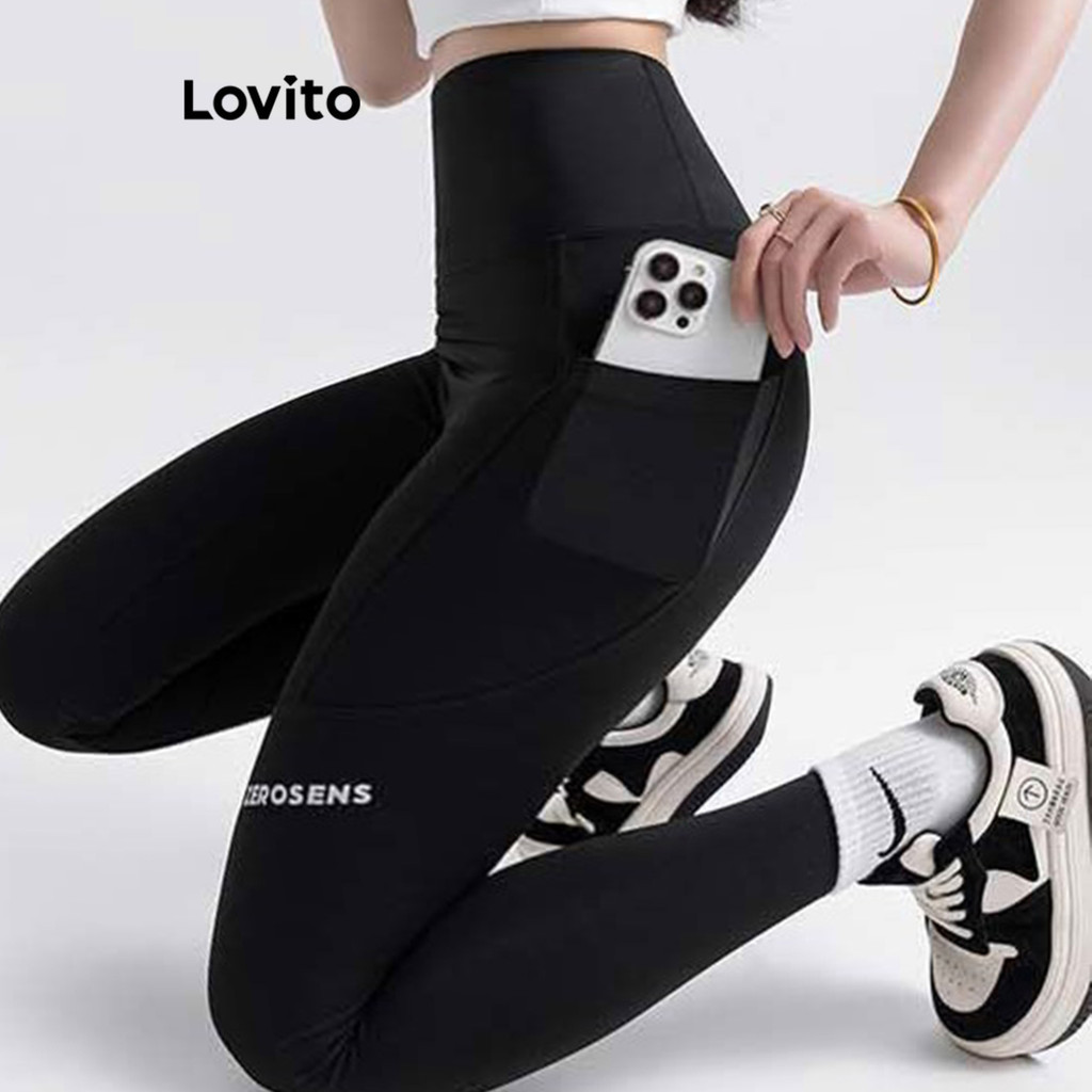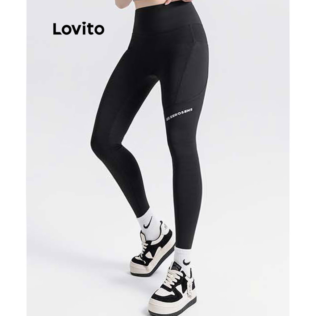 Lovito Quần legging thể thao co giãn cao in chữ l26ad043 (xám, hồng, xanh dương, đen)
