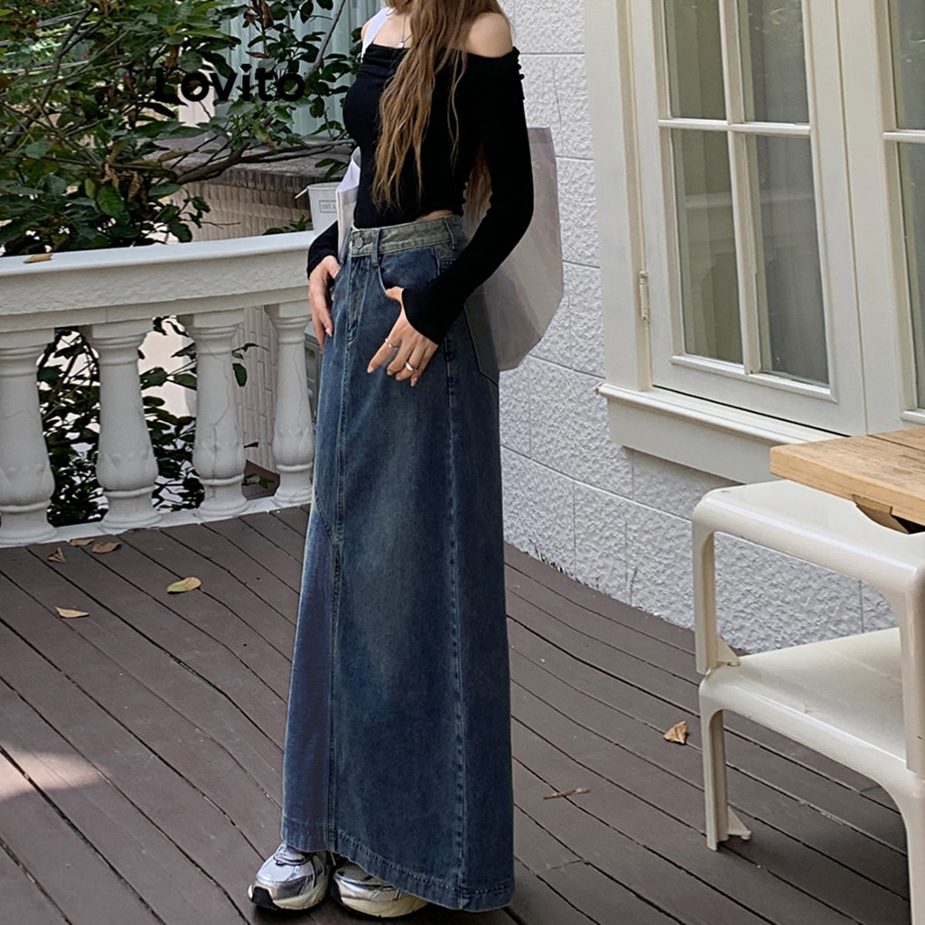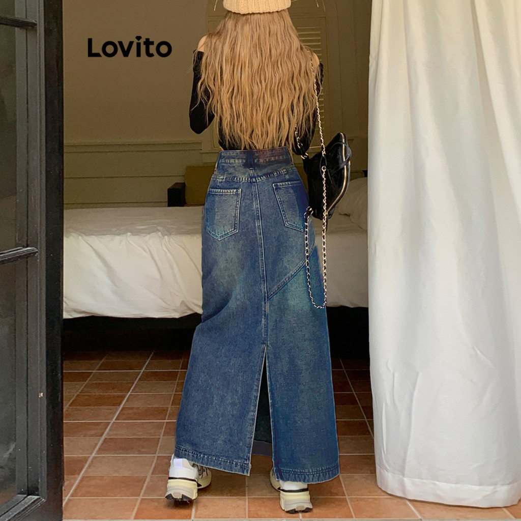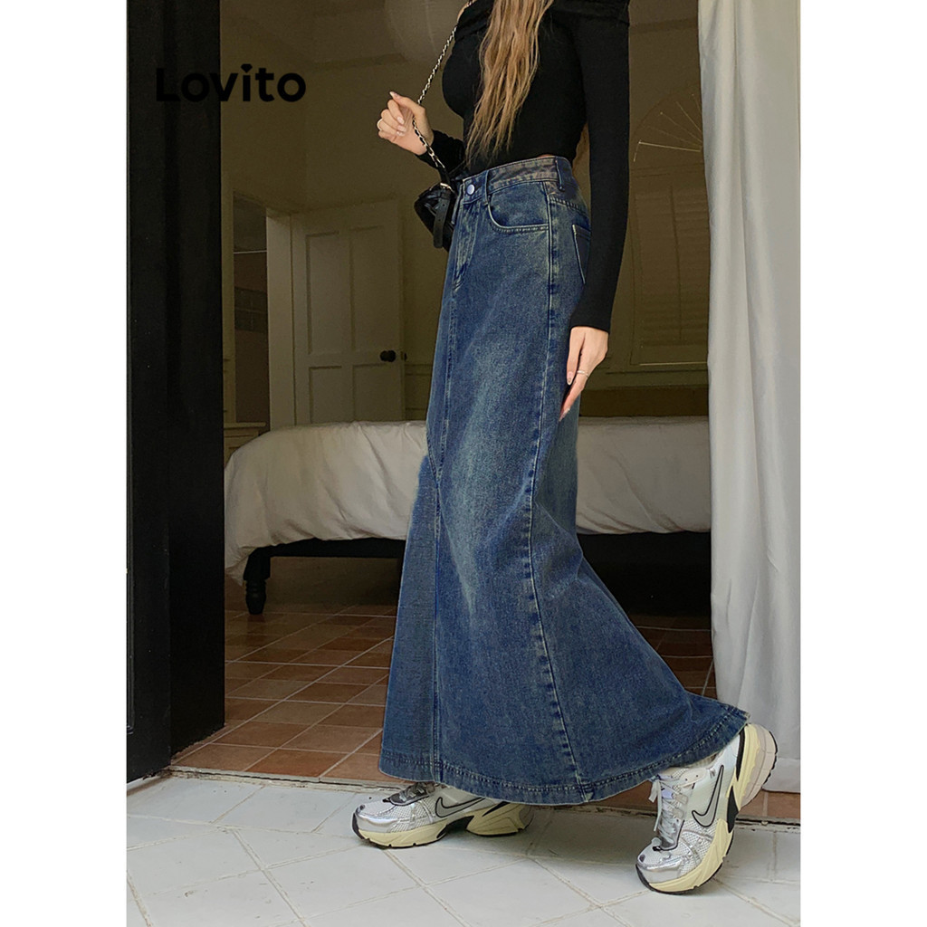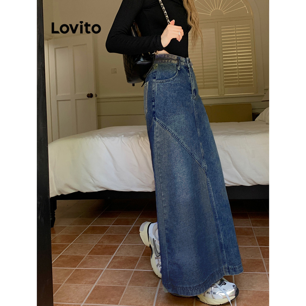 Lovito Chân váy denim có túi màu trơn thường ngày cho Nữ l37ad066 (màu xanh dương)