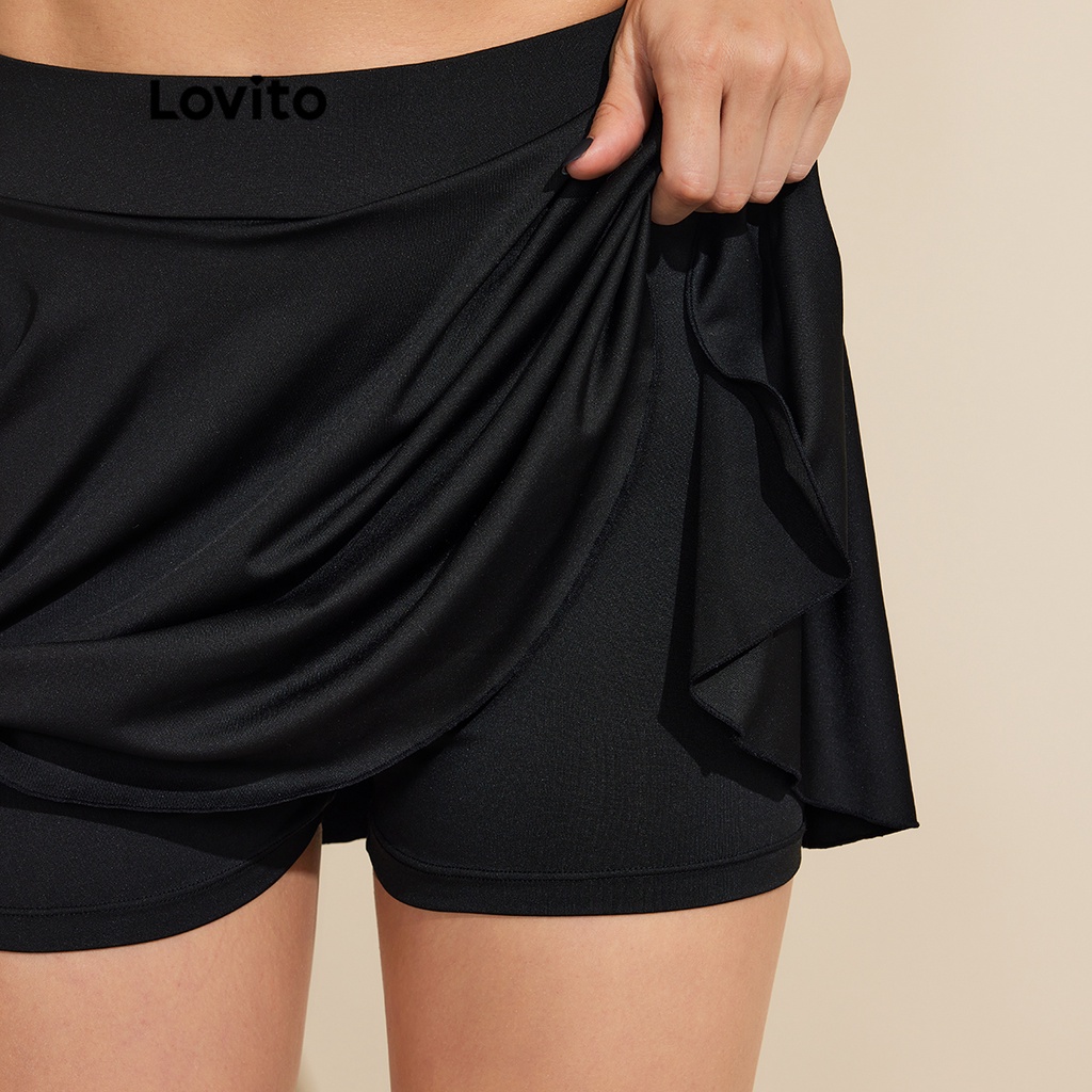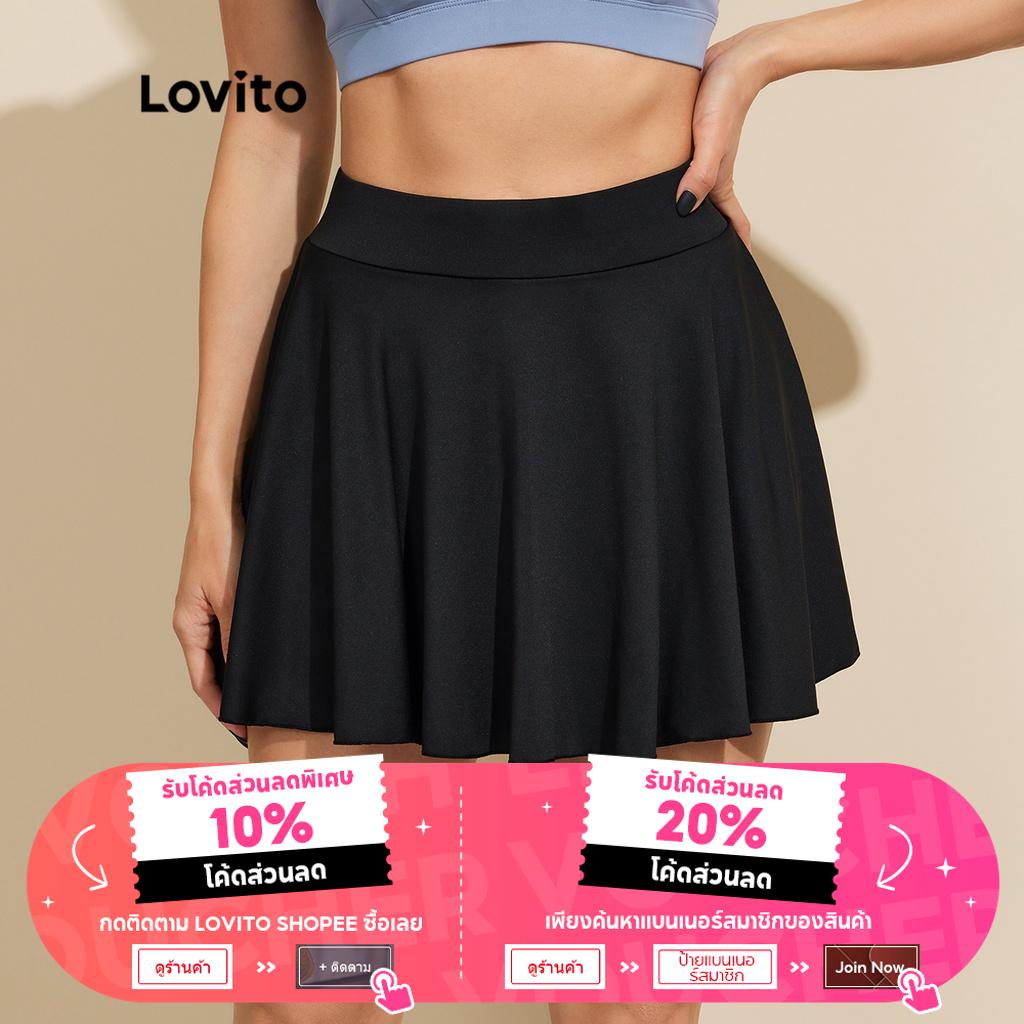 Lovito quần đùi nữ màu trơn thường ngày xếp li phong cách l65ed070 (Màu Đen)