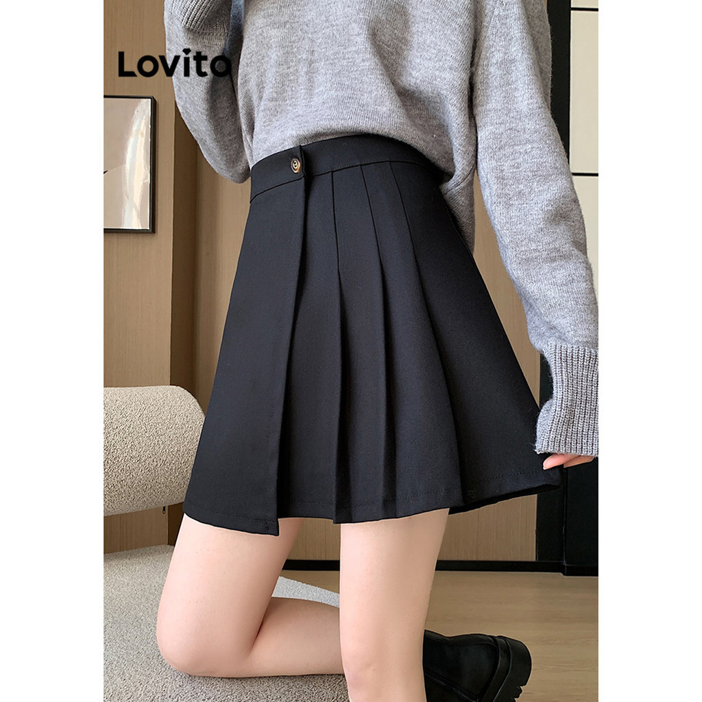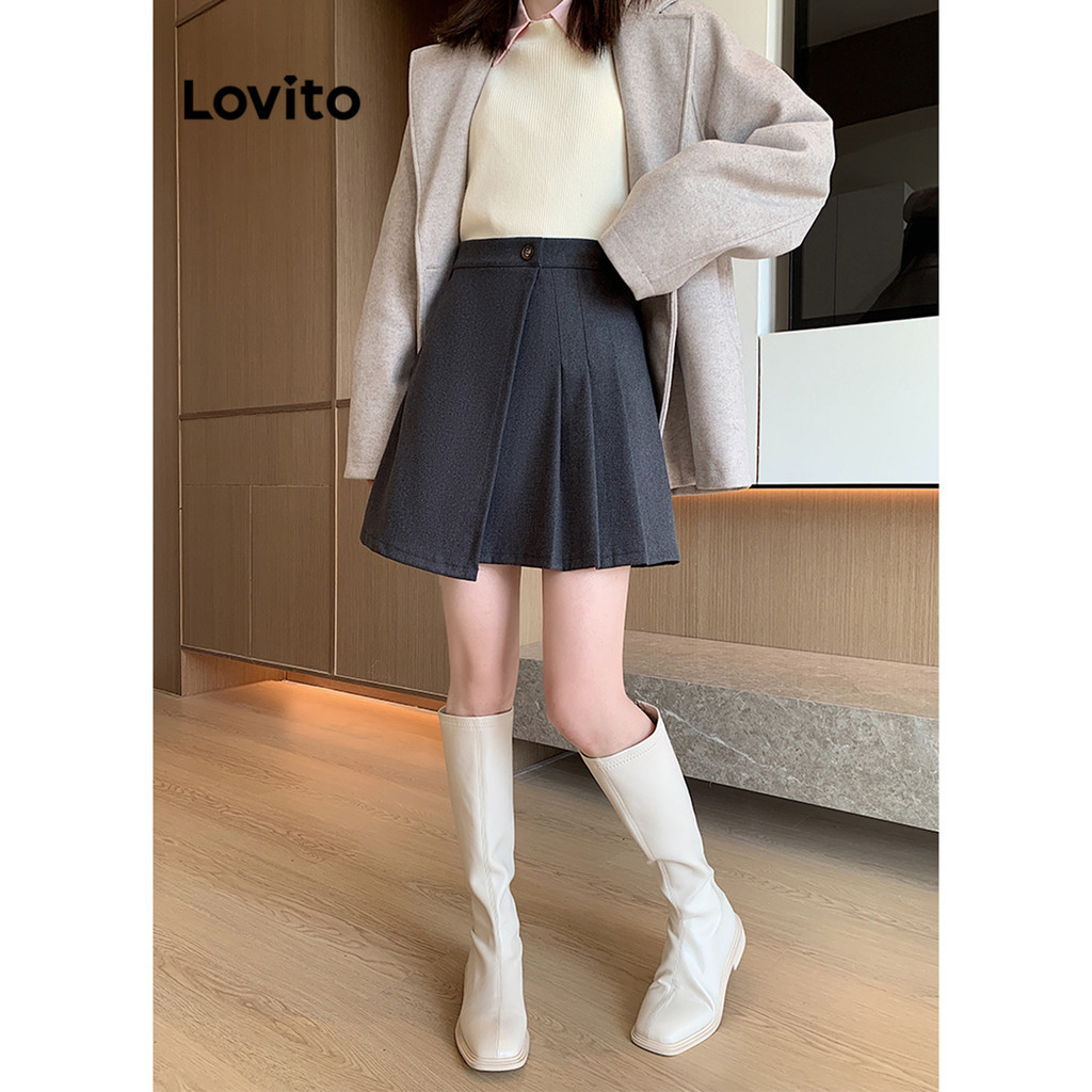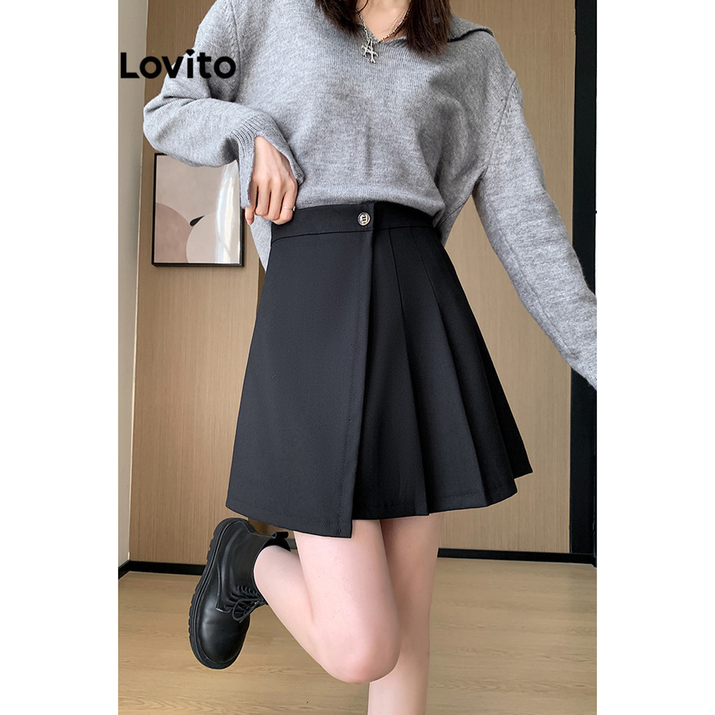Lovito chân váy xếp li cho nữ phong cách thường ngày màu trơn lna27405 (Xám/Đen)