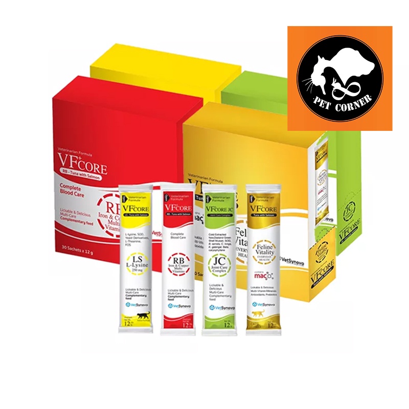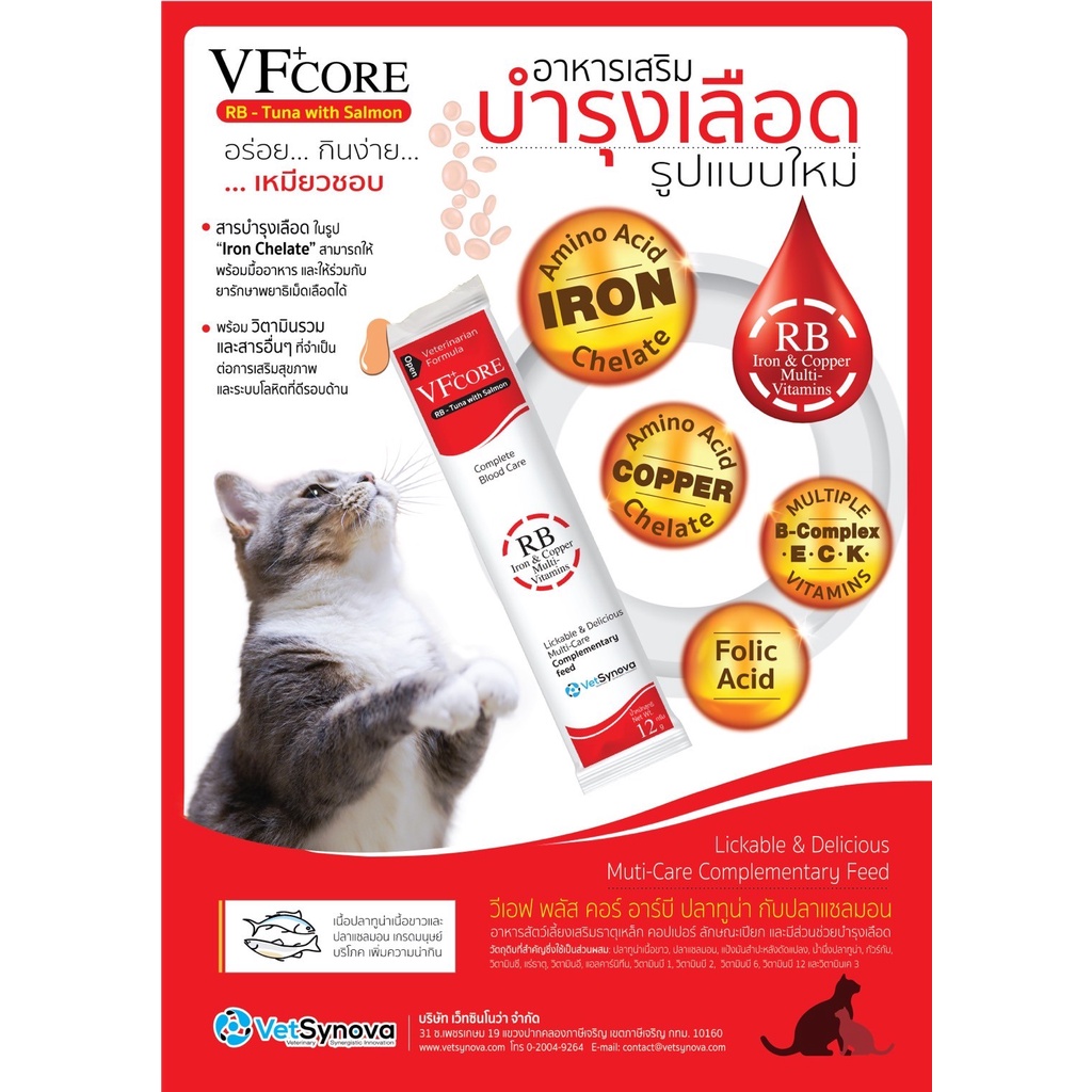 (ยกกล่อง) ขนมแมวเลีย VF Core ไลซีน, บำรุงเลือด, บำรุงข้อต่อ ขนาด 12 g.x 30 ซองVFcore สีเเดง อาหารเสริมบำรุงเลือดรูปเเบบใหม่ ในรูปเเบบขนม ทานง่าย รสทูน่าเเละเเซลม่อน สูตรนี้ทานได้ทั้งหมาเเละเเมว