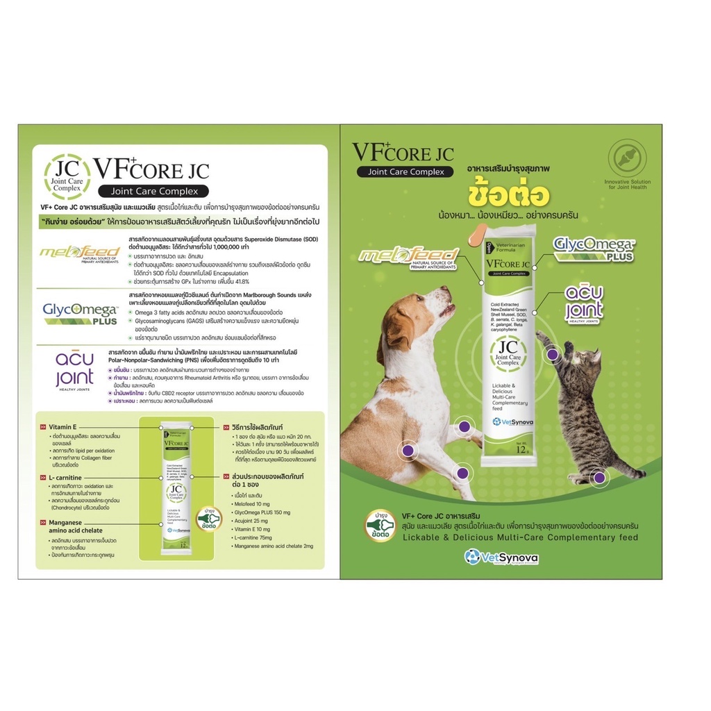 VFcore สีเขียว อาหารเสริมบำรุงข้อ รูปเเบบใหม่ ในรูปเเบบขนม ทานง่าย รสไก่เเละตับ สูตรนี้ทานได้ทั้งหมาเเละเเมว