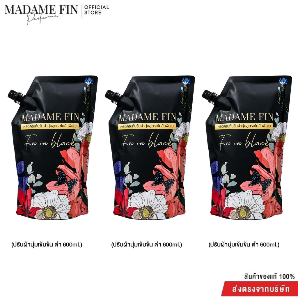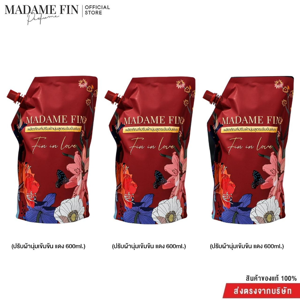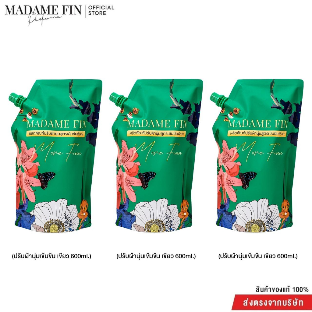 Madame Fin น้ำยาปรับผ้านุ่มคละกลิ่น 3 ถุง ขนาดถุงละ 600 มิลลิลิตรด้วยกลิ่นหอมเข้มข้น กลิ่นเดียวกับน้ำหอมคลาสสิคที่เป็นเอกลักษณ์ที่สุดของมาดามฟิน