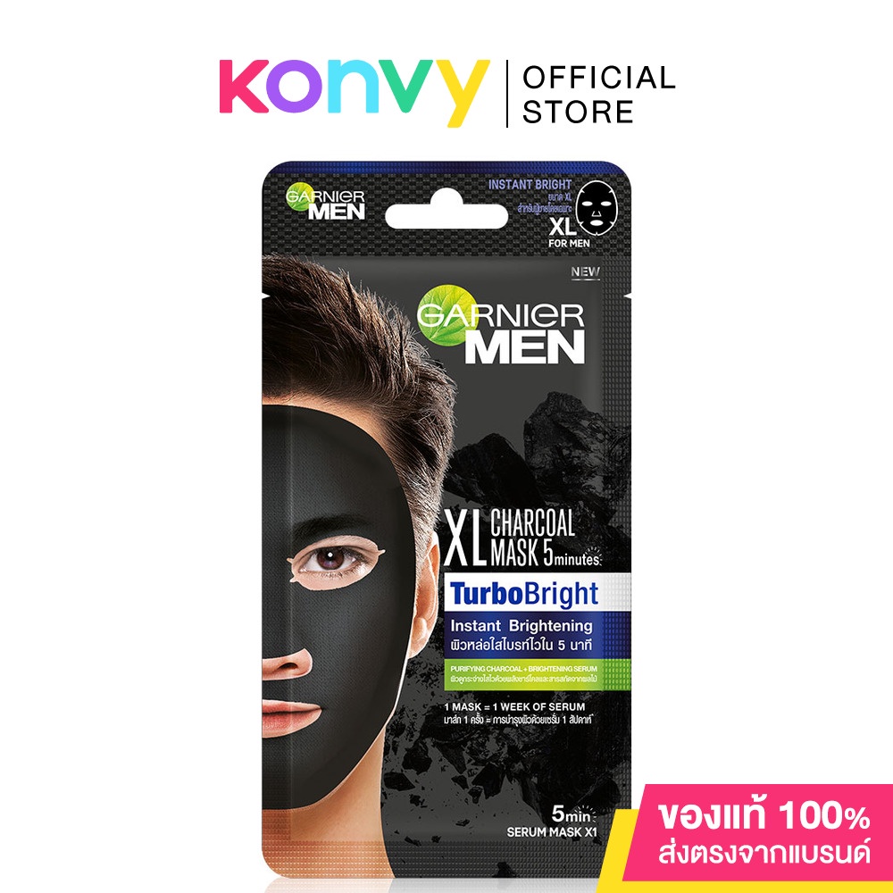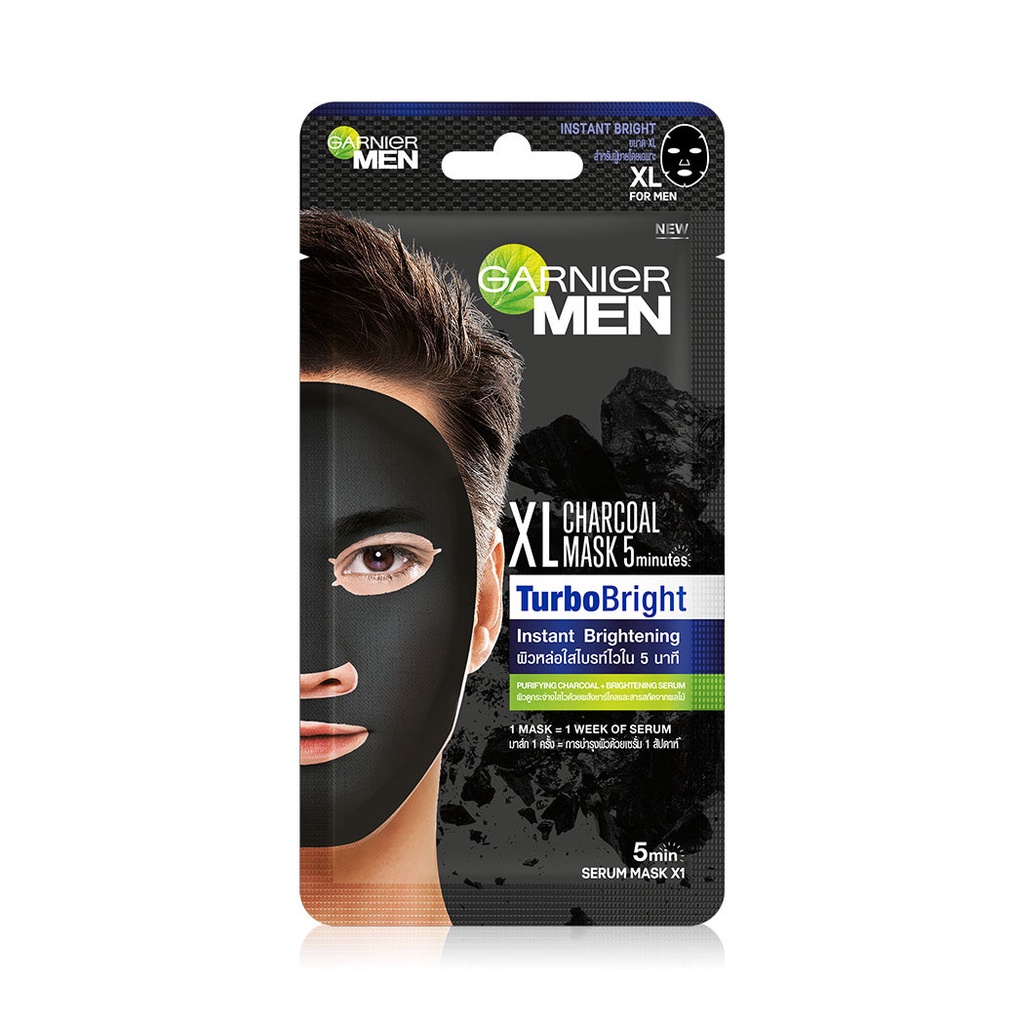 Garnier Men Chacoal Mask Turbo Bright 24gครั้งแรกของแผ่นมาสก์ชาร์โคล XL ที่จะเป็นทางลัดผิวดูหล่อใส ที่ออกแบบพิเศษให้เหมาะกับโครงหน้าผู้ชายโดยเฉพาะ สูตรเข้มข้น มาสก์ 1 ครั้งเสมือนการใช้เซรั่มบำรุงผิว แผ่นมาสก์หน้าสีดำพลังชาร์โคลที่เป็นที่ยอมรับว่ามีคุณสมบัติช่วยดูดซับสิ่งสกปรก เสมือนการดีท็อกซ์ เพื่อให้ผิวรู้สึกสะอาดอย่างล้ำลึกใน 15 นาที ผสานด้วยสาร AHA ที่ช่วยผลัดเซลล์ผิวหมองคล้ำและฟื้นบำรุงให้ผิวดูกระจ่างใสขึ้น• ออกแบบพิเศษให้เหมาะกับโครงหน้าผู้ชายโดยเฉพาะ
