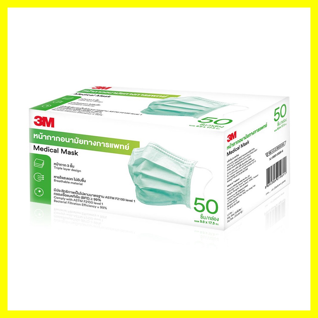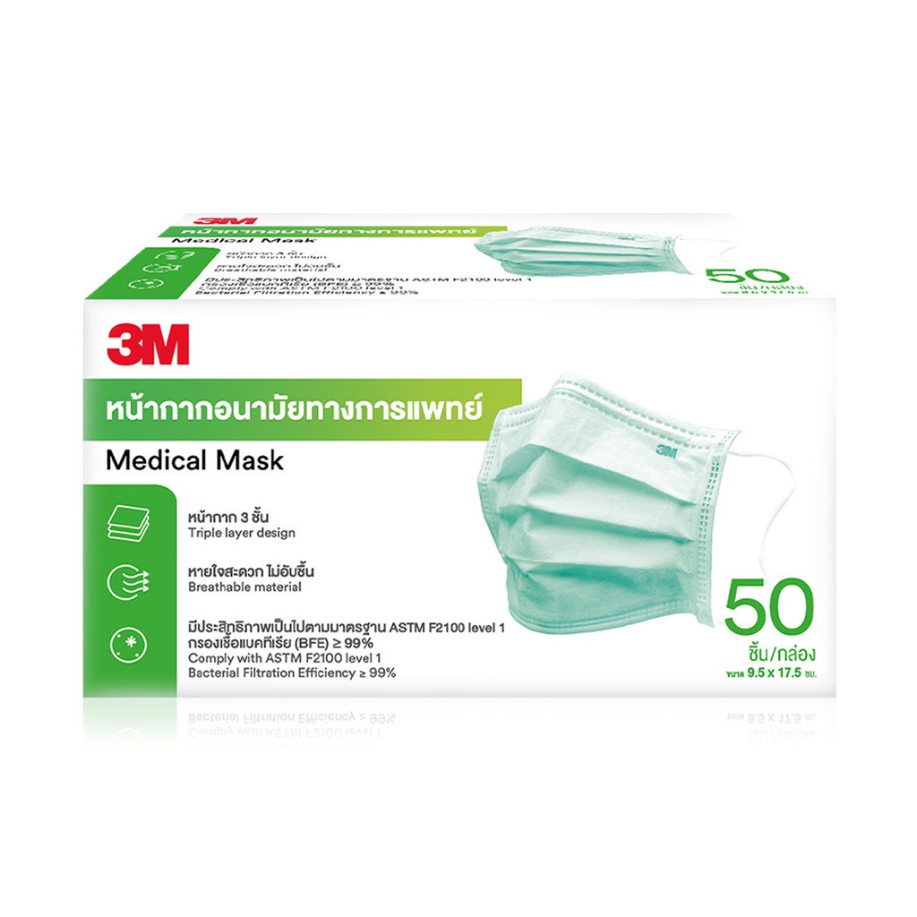 3M Nexcare Green Earloop Mask 50pcs หน้ากากอนามัยเพื่อสุขภาพป้องกันฝุ่น ละอองน้ำ และป้องกันการแพร่กระจายเชื้อโรคและแบคทีเรียได้ อ่อนนุ่ม ไม่ระคายเคืองต่อผิว ไม่อับชื้น หายใจสะดวก• หน้ากากอนามัย 3 ชั้น