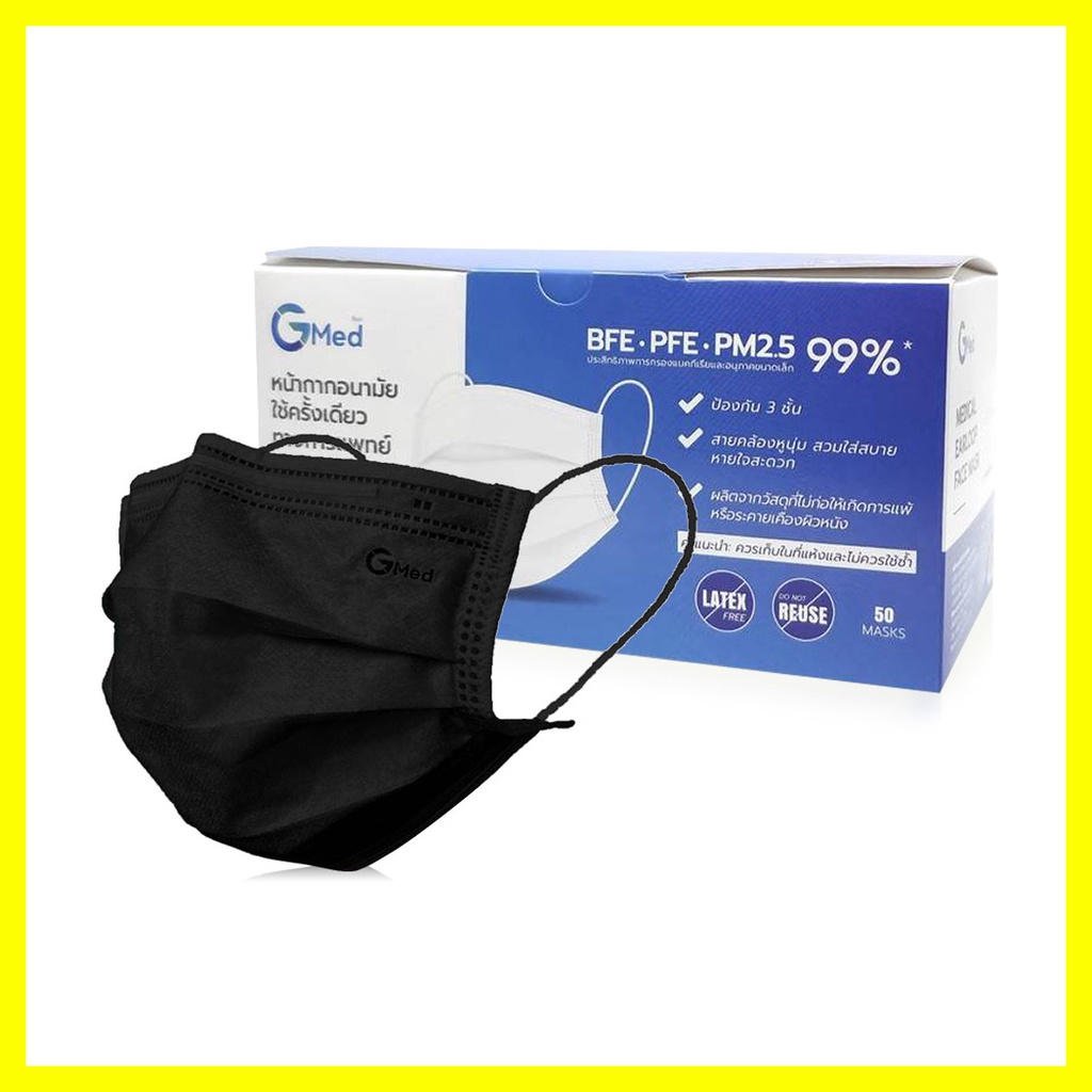 GMed Medical Earloop Face Mask #Black [50pcs]หน้ากากอนามัยใช้ครั้งเดียว ชนิดคล้องหู สีดำ ป้องกัน 3 ชั้น ใส่สบาย หายใจสะดวก ป้องกันแบคทีเรียได้มากกว่า 99% พร้อมป้องกันฝุ่นละอองและมลพิษ โดยไม่ก่อให้เกิดอาการแพ้หรือระคายเคือง• ป้องกัน 3ชั้น