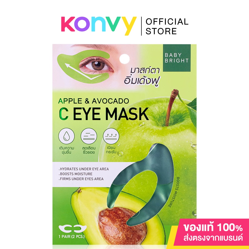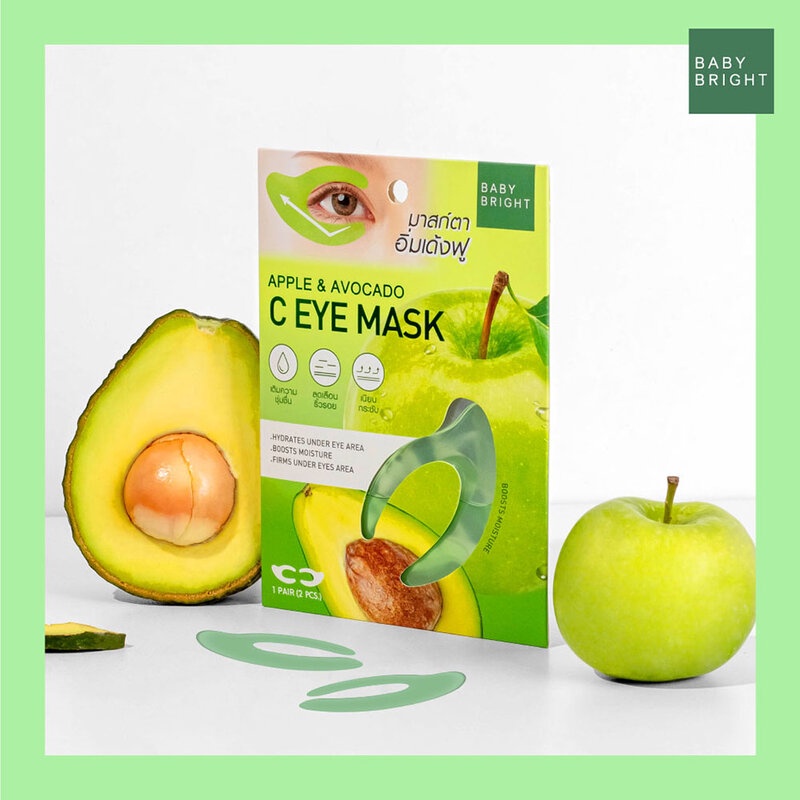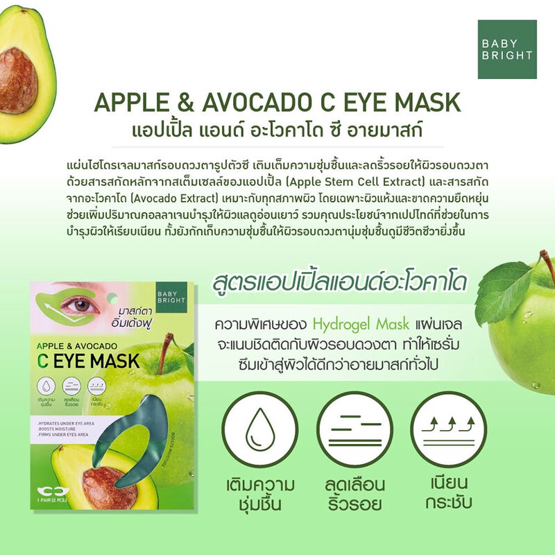 Baby Bright Apple & Avocado C Eye Mask 7g [3.5g x 2pcs] แผ่นเจลมาสก์รอบดวงตารูปตัวซี เติมเต็มความชุ่มชื้นและลดริ้วรอยให้ผิวรอบดวงตา ด้วยสารสกัดจากสเต็มเซลล์ของแอปเปิ้ล สารสกัดจากอะโวคาโด และเรตินอล ที่อุดมไปด้วยวิตามินเอ, ดี และอี ซึ่งเป็นสารแอนตี้ออกซิแดนท์ รวมทั้งมีโปรตีน เลซิติน เบต้าแคโรทีน และกรดไขมันไม่อิ่มตัวที่จำเป็น เหมาะกับทุกสภาพผิว โดยเฉพาะผิวแห้งและขาดความยืดหยุ่น ช่วยเพิ่มปริมาณคอลลาเจนบำรุงให้ผิวแลดูอ่อนเยาว์ ช่วยลดเลือนริ้วรอยอย่างมีประสิทธิภาพ ผสานสารสกัดจากเมือกหอยทากทองคำ และสารสกัดจากกีวี ที่มีส่วนประกอบของสารแอนตี้ออกซิแดนท์ ช่วยต้านการอักเสบของผิวหนัง รวมคุณประโยชน์จากเปปไทด์ที่ช่วยในการบำรุงผิวพรรณให้เรียบเนียน ทั้งยังกักเก็บความชุ่มชื้น ให้ผิวรอบดวงตานุ่มชุ่มชื้นดูมีชีวิตชีวายิ่งขึ้น• ความพิเศษของ Hydrogel Mask แผ่นเจลแนบชิดติดกับผิวรอบดวงตา ทำให้เซรั่มซึมเข้าสู่ผิวได้ดีกว่าอายมาสก์ทั่วไป
