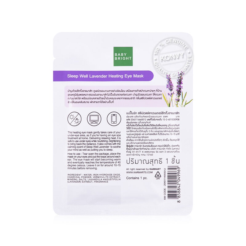 Baby Bright Sleep Well Lavender Heating Eye Mask (Y2022)บอกลาถุงใต้ตาและสายตาอ่อนล้าด้วยฮีตติ้งอายมาสก์ดูแลผิวรอบดวงตาอย่างอ่อนโยนเสมือนการทำสปาดวงตาง่ายๆที่บ้านอุณหภูมิอุ่นพอเหมาะของแผ่นอายมาส์กไม่เป็นอันตรายต่อดวงตาช่วยกระตุ้นการไหลเวียนโลหิตให้ดีขึ้นคลายอาการเมื่อยล้าดวงตาลดอาการตาบวมให้ดวงตากลับมาสดใสสุขภาพดีพร้อมผ่อนคลายด้วยน้ำมันหอมระเหยจากธรรมชาติคือกลิ่นสลีปเวลล์ลาเวนเดอร์ช่วยให้นอนหลับสบายพักสายตาได้อย่างเต็มที่• ดอกลาเวนเดอร์ดูแลผิวรอบดวงตาอย่างอ่อนโยนผ่อนคลายด้วยน้ำมันหอมระเหยกลิ่นดอกลาเวนเดอร์จากธรรมชาติ