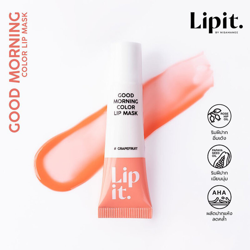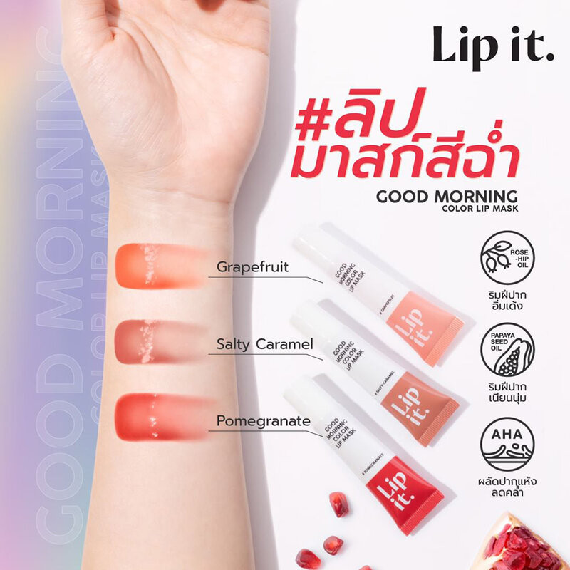 Lip It Good MorningColor Lip Mask 2.4g #01 Grapefruitเริ่มต้นการบำรุงกับลิปมาสก์ให้ริมฝีปากสวยในทุกวัน อุดมด้วยคุณค่าของโจโจ้บาออยล์, โรสฮิปออยล์, มีโดว์โฟมออยล์และออยล์จากเมล็ดมะละกอ เพื่อช่วยปกป้องริมฝีปากจากการสูญเสียความชุ่มชื้น ผสานวิตามินซี และ AHA จากกรดผลไม้ ผลัดผิวอย่างอ่อนโยน มาพร้อมกลิ่นหอมสดชื่นของผลไม้ เผยสัมผัสริมฝีปากเรียบเนียนอิ่มเด้ง