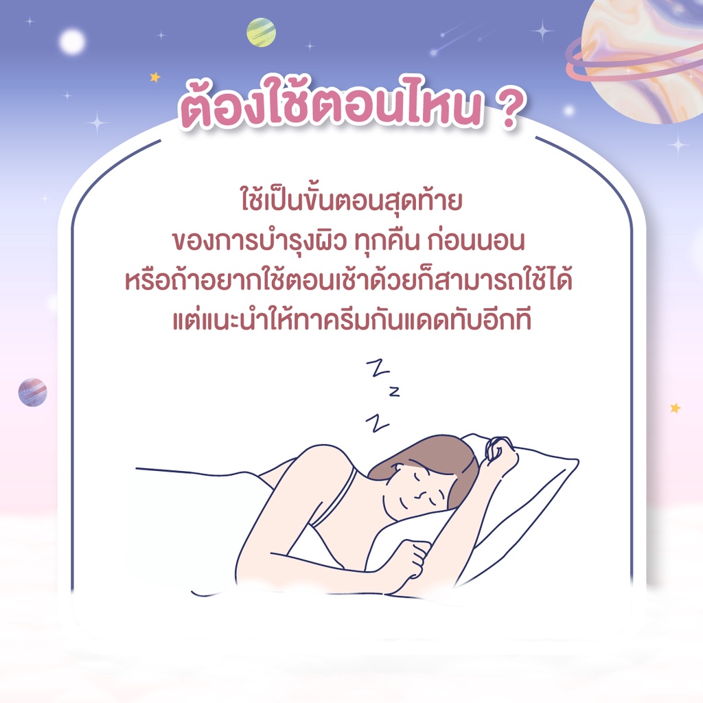 วิธีใช้ : ทาสลีปปิ้งมาส์กบริเวณใบหน้าและลำคอในปริมาณที่มากกว่าการทาครีมปกติ เป็นขั้นตอนสุดท้ายของการบำรุงผิวก่อนนอนโดยไม่ต้องล้างออก (ใช้ได้เป็นประจำทุกคืน)