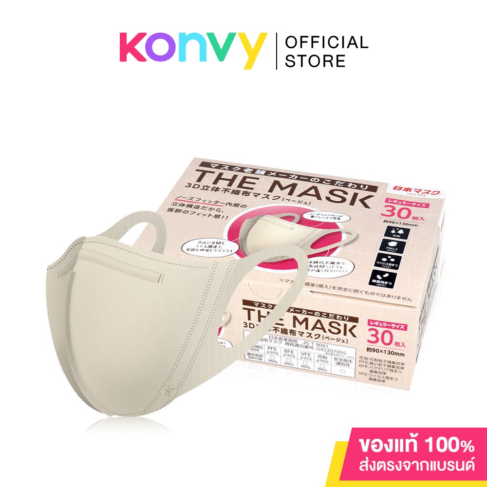 Nippon Mask The Mask 3D Non-Woven Mask 30P #White [30pcs] หน้ากากอนามัยเพื่อสุขภาพรูปทรง 3D ชนิด สีขาว 30 ชิ้น ช่วยป้องกันฝุ่นละอองขนาดเล็ก PM 2.5 ละอองเกสรดอกไม้ และการแพร่กระจายของเชื้อโรคได้ถึง 99% ได้รับการรับรองมาตรฐานจากสถาบันจากประเทศญี่ปุ่น ออกแบบตามหลักสรีระเหมาะสำหรับสวมใส่ทุกโครงหน้า รูปทรงสามมิติ หายใจได้สะดวก รูปทรงทันสมัย รับกับใบหน้า เสริมสร้างความมั่นใจ ผลิตจากวัสดุพิเศษ มีความนุ่ม ยืดหยุ่นสูง ไม่ระคายเคืองผิวหนังเมื่อสวมใส่เป็นเวลานาน•ฟิลเตอร์กรอง 3 ชั้น