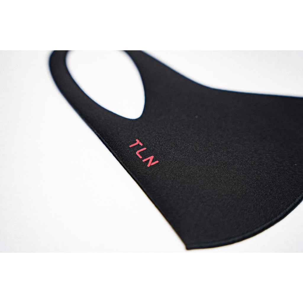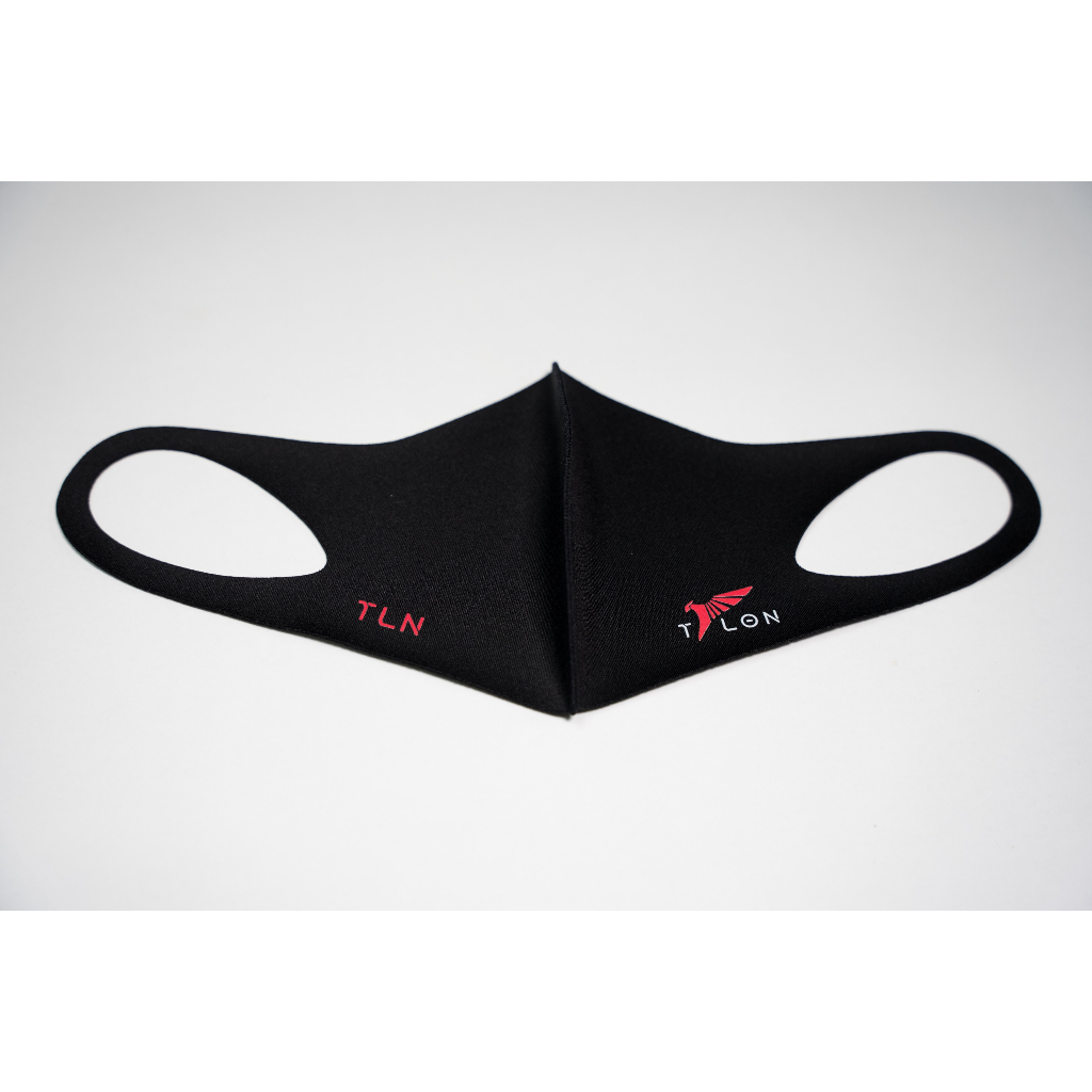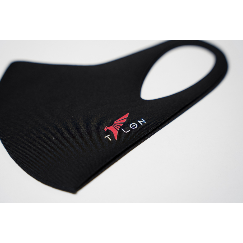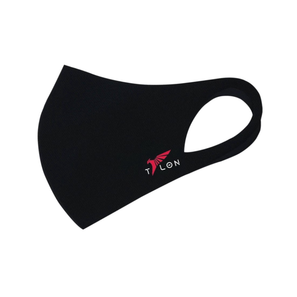 หน้ากากผ้า Talon สีดำ ทรงสวยด้านซ้าย สกรีนโลโก้เหยี่ยว และคำว่า TALON