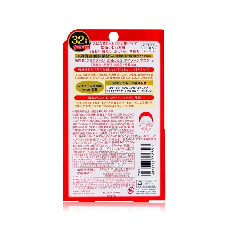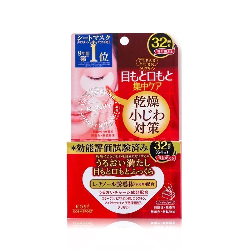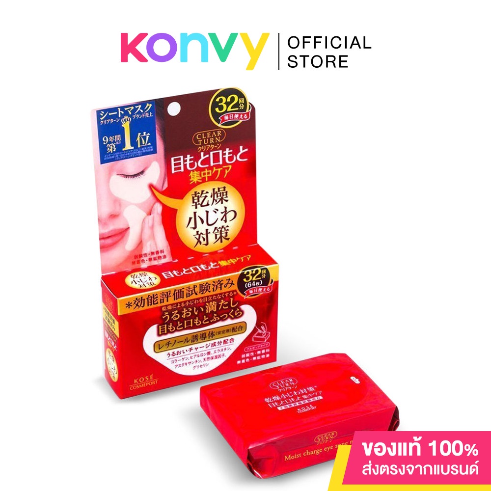 Clear Turn Moist Charge Eye Zone Mask แผ่นมาสก์สำหรับผิวบริเวณรอบดวงตาและริมฝีปาก มีส่วนผสมของเรตินอล คอลลาเจน ไฮยาลูรอน แอสตาแซนติน และสมุนไพรจากธรรมชาติ ช่วยให้ผิวหน้าดูอวบอิ่ม ถุงใต้ตาดูกระจ่างใส คงความชุ่มชื้นให้กับผิวหน้า พร้อมลดริ้วรอย กระชับผิวบริเวณรอบดวงตา และริมฝีปาก• มีส่วนผสมของเรตินอล คอลลาเจน ไฮยาลูรอน แอสตาแซนติน และสมุนไพรจากธรรมชาติ