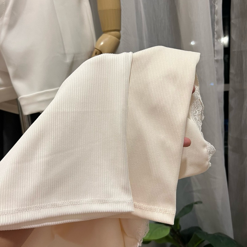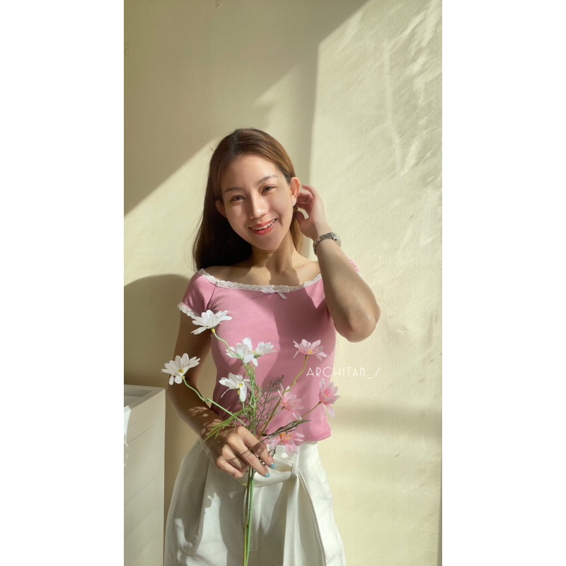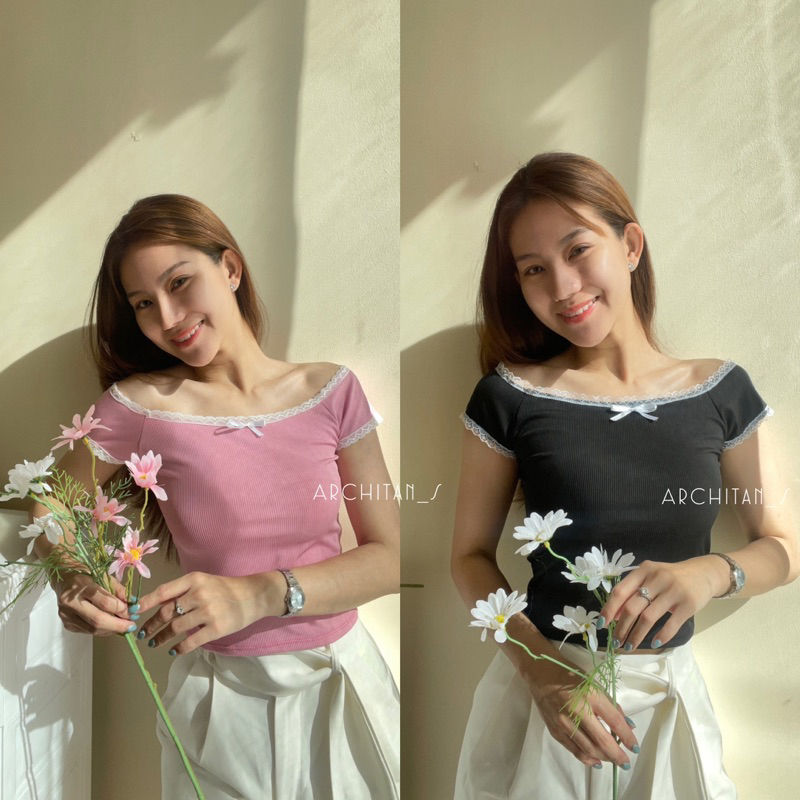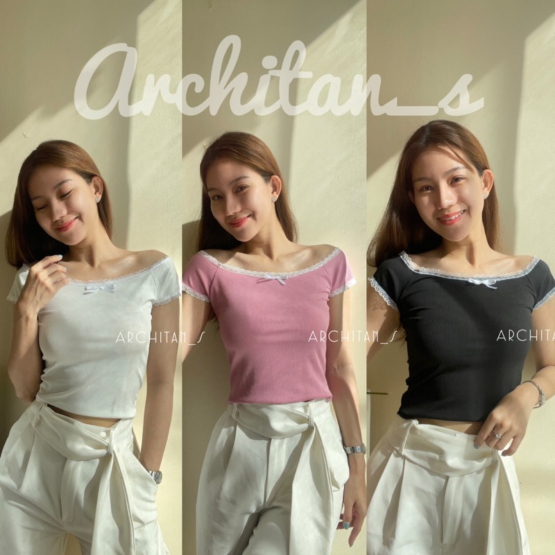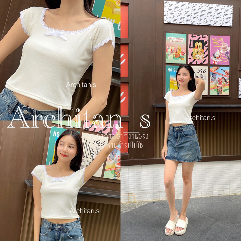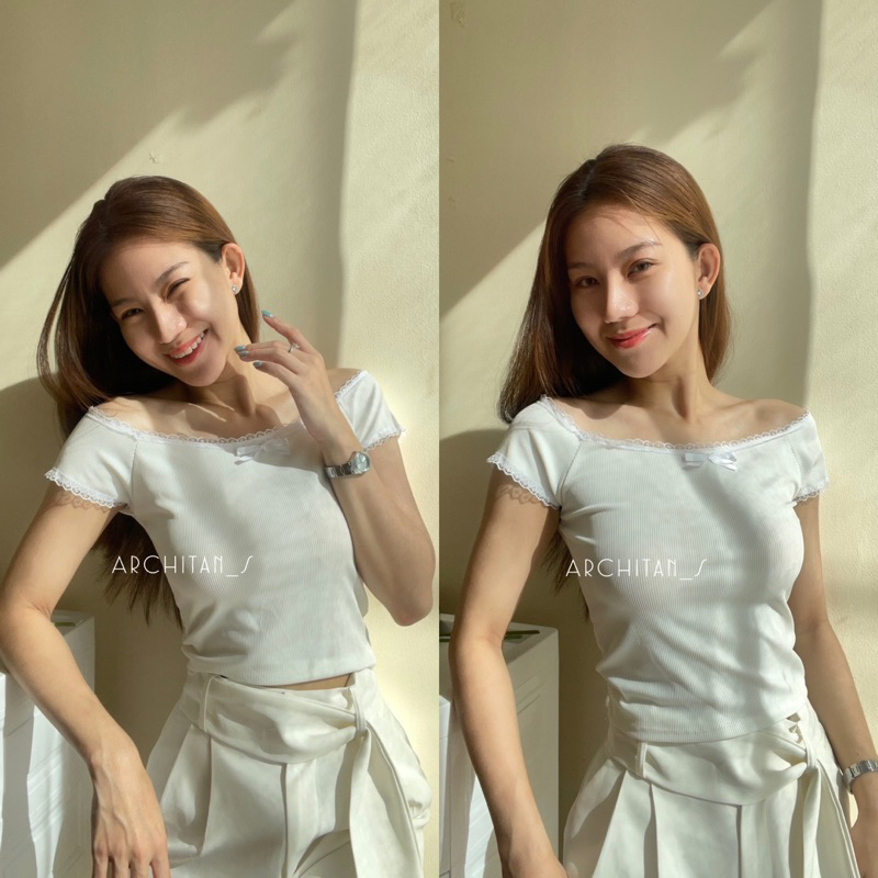 ครอปเเขนสั้นดีเทลลูกไม้ ใส่เปิดไหล่ได้จ้า เเนวลูกคุณมากมาย ไม่โป๊ค่ะ เเมทส์ได้หลากหลาย
