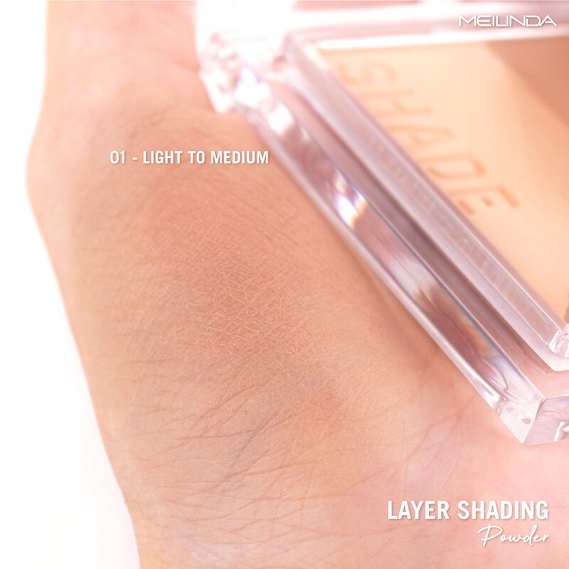 Mei Linda Layer Shading Powder 7g #01 Light To Medium เฉดดิ้งเนื้อนุ่ม เนียนละเอียด เบลนด์ง่าย เพื่อสร้างมิติให้ใบหน้า ด้วยการไล่ระดับสามโทนสีในตลับเดียว ทำให้ใบหน้าดูเรียวอย่างเป็นธรรมชาติ• #01 Light To Medium ผิวขาว-ผิวกลาง