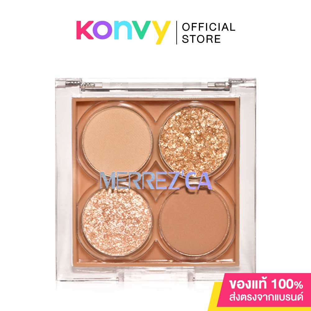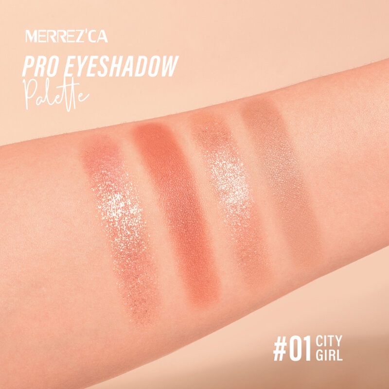 Merrezca Pro Eyeshadow Palette 0.7g #01 City Girl พาเลทอายแชโดว์ 4 เฉดสี มีทั้งเนื้อแมท ชิมเมอร์ และกลิตเตอร์ เนื้อนุ่มเบาสบาย ไม่หนักตา กันน้ำ กันเหงื่อ ติดทนยาวนานตลอดวัน ไม่เยิ้ม ไม่เลอะ แม้เปลือกตามัน• 4 เฉดสี มีทั้งเนื้อแมท ชิมเมอร์ และกลิตเตอร์
