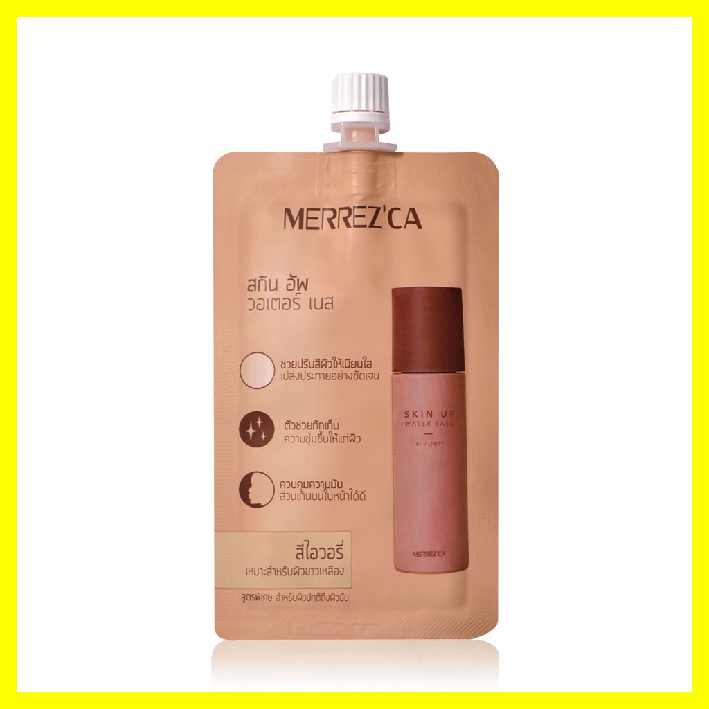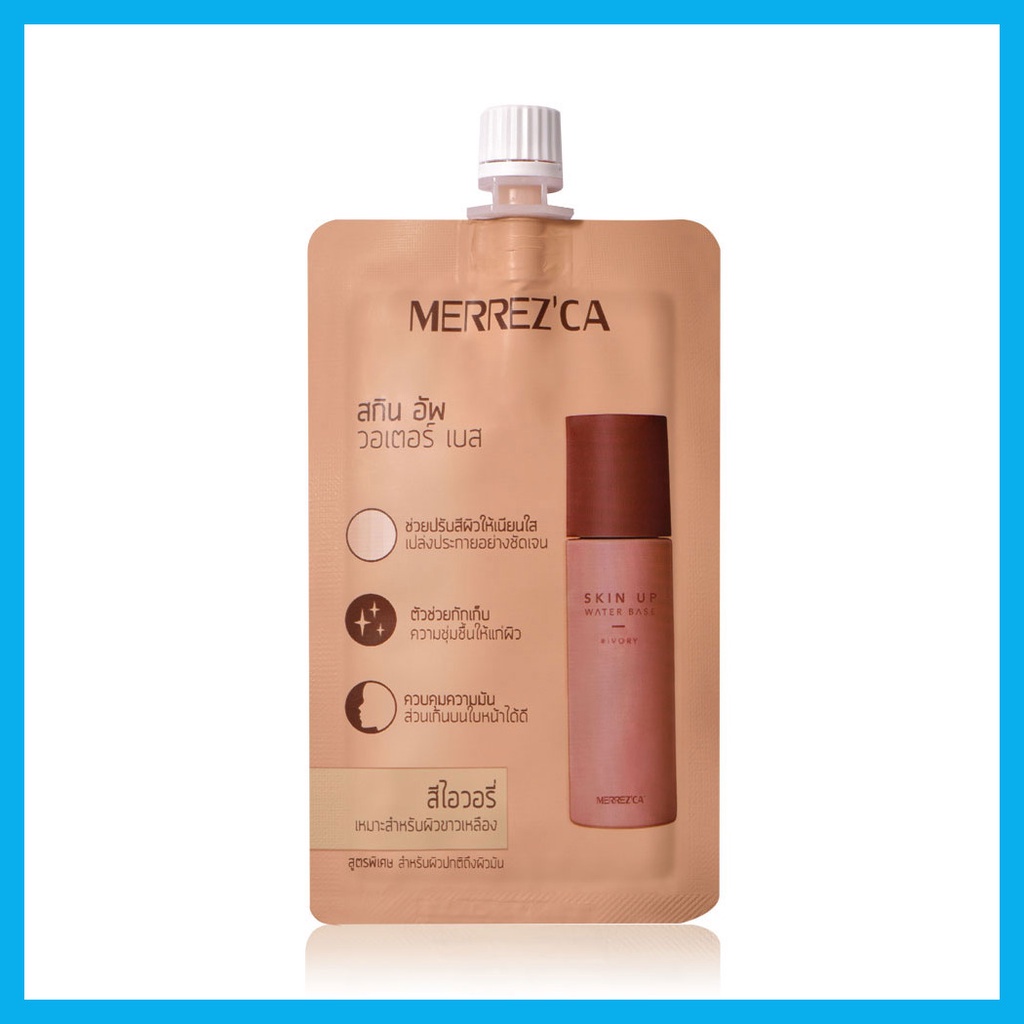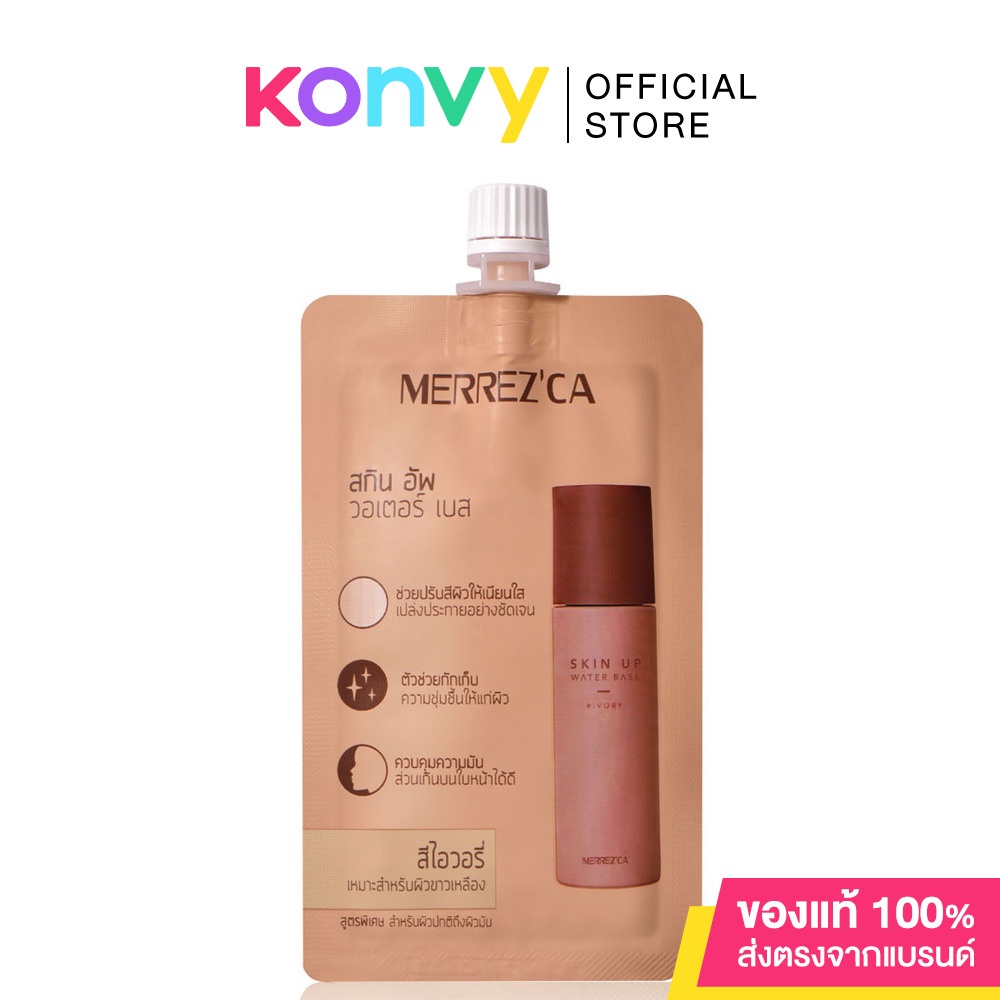 Merrez'ca Skin Up Water Base 5g #Ivory เมคอัพเบสเนื้อสัมผัสบางเบา เกลี่ยง่าย ซึมซาบเร็ว กันน้ำ กันเหงื่อ ติดทนนาน ช่วยปรับสภาพผิวก่อนลงรองพื้น อำพรางความหมองคล้ำบนใบหน้า และปรับสีผิวให้ดูสม่ำเสมอ ผิวดูเนียนใส และช่วยควบคุมความมันบนใบหน้า เผยผิวดูเรียบเนียนกระจ่างใสอย่างเป็นธรรมชาติ พร้อมเติมความชุ่มชื้นให้กับผิว ด้วยสารสกัดจากมะพร้าว• #Ivory เหมาะสำหรับผิวขาวเหลือง