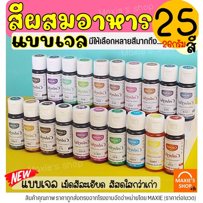 สีผสมอาหารเจล MAXIE ขนาด26กรัม(มีให้เลือกซื้อ25สี!)สีเจลผสมอาหาร เป็นสีที่ให้เม็ดสีเข้ม เนื้อครีมละเอียด สามารถใช้ได้ในปริมาณที่น้อยแต่มีประสิทธิภาพสูง เหมาะสำหรับผสมในอาหาร ขนม รวมไปถึงเบเกอรี่ต่าง ๆ โดยเฉพาะผสมใส่ในแป้งน้ำตาลฟองดองสำหรับแต่งหน้าเค้ก บอกเลยว่าให้สีที่เนียน ละเอียด ถูกใจสายทำขนมแน่นอนค่า นอกจากนี้ยังเหมาะกับการผสมในครีมแต่งหน้าเค้ก ช่วยเพิ่มสีสันให้น่ารับประทาน