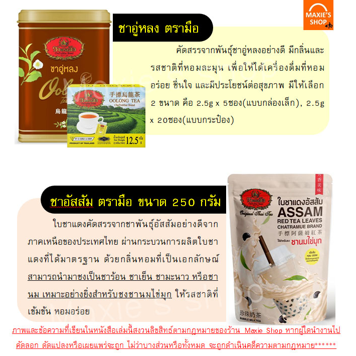 ชาตรามือ ถุงสีทอง ชาไทยสูตร Extra gold ชาแดงปรุงสำเร็จชนิดผง กลิ่นวานิลา (สูตร 1) คัดสรรพันธุ์อย่างดี เหมาะสำหรับผลิตชาแดง คงรสชาติแบบชาไทยที่เข้มข้น หอม อร่อย ถูกคอ ถูกใจผู้ดื่ม เหมาะสำหรับชงชาไทย ชาดำเย็น ดื่มได้ทั้งร้อน – เย็น มีให้เลือก 3 ขนาด ได้แก่ ถุง 400 กรัม, กระป๋อง 450 กรัม, ซองเยื่อ 2.5gx50ซอง(กระป๋อง) เลขอย 57-2-02561-6-0003