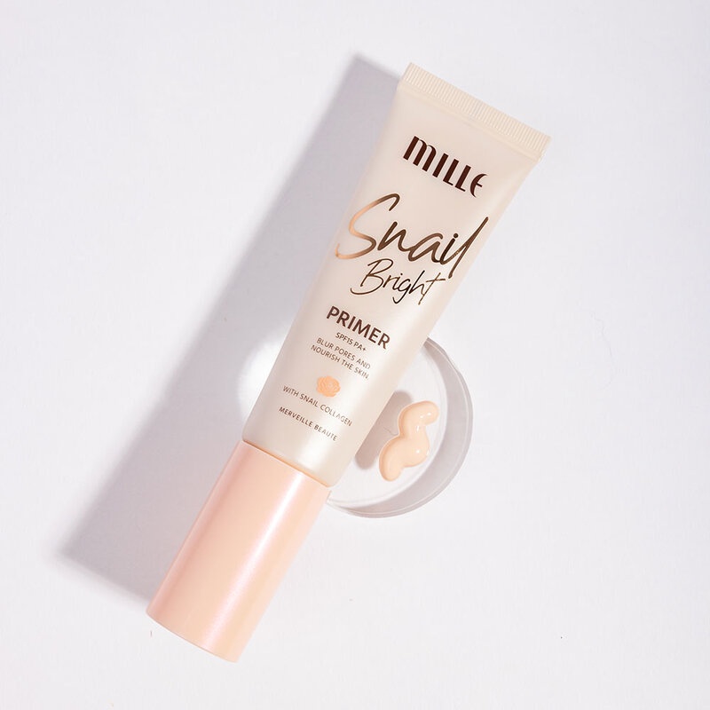 หลังขั้นตอนบำรุงผิว ทา Mille Snail Bright Primer SPF15/PA+ บางๆ ให้ทั่วใบหน้า ก่อนลงเมคอัพในขั้นตอนต่อไป