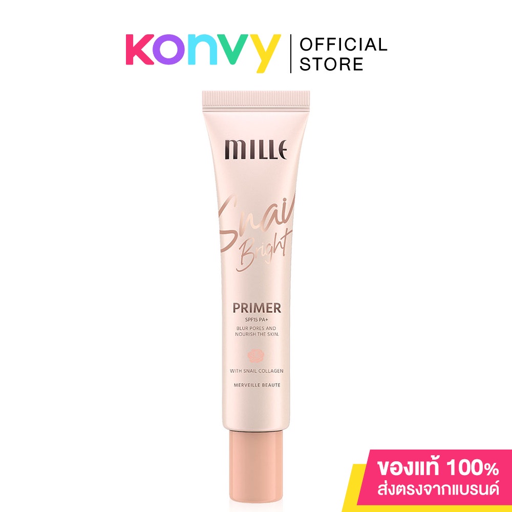 Mille Snail Bright Primer SPF15/PA+ 30g ผลิตภัณฑ์ไพรเมอร์สำหรับใช้ทาก่อน หรือผสมพร้อมกับ Mille Super Whitening Rose BB Cream ช่วงอำพรางผิวให้เรียบเนียน พร้อมมอบความชุ่มชื้นให้ผิวหน้าสวยผ่องดูสุขภาพดีตลอดเวลา ไม่หมองคล้ำระหว่างวัน ด้วยสารสกัดจากเมือกหอยทากเพิ่มความยืดหยุ่นกระชับให้แก่ผิว• อำพรางรูขุมขน