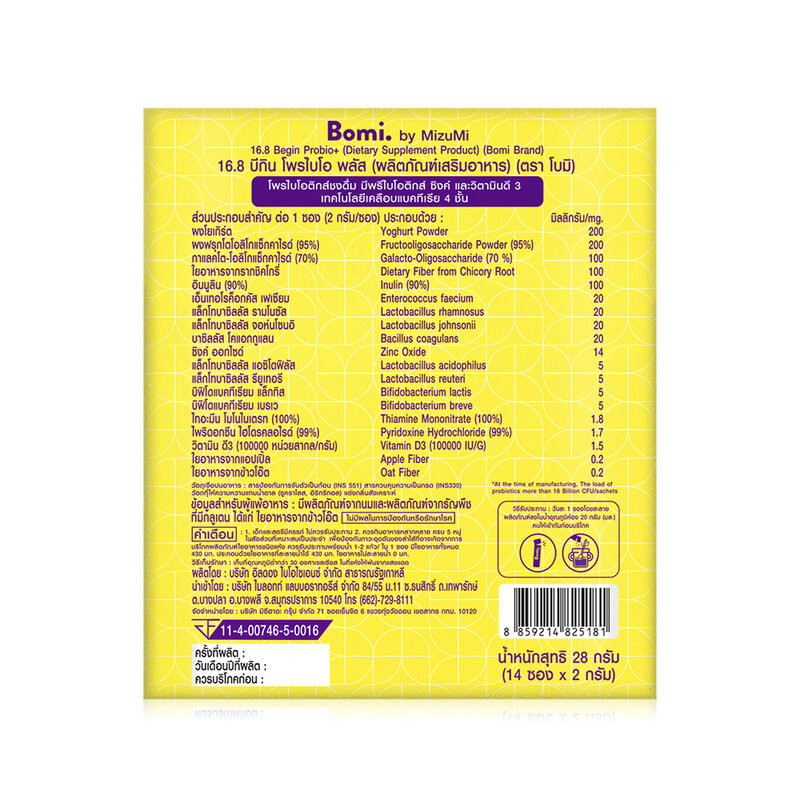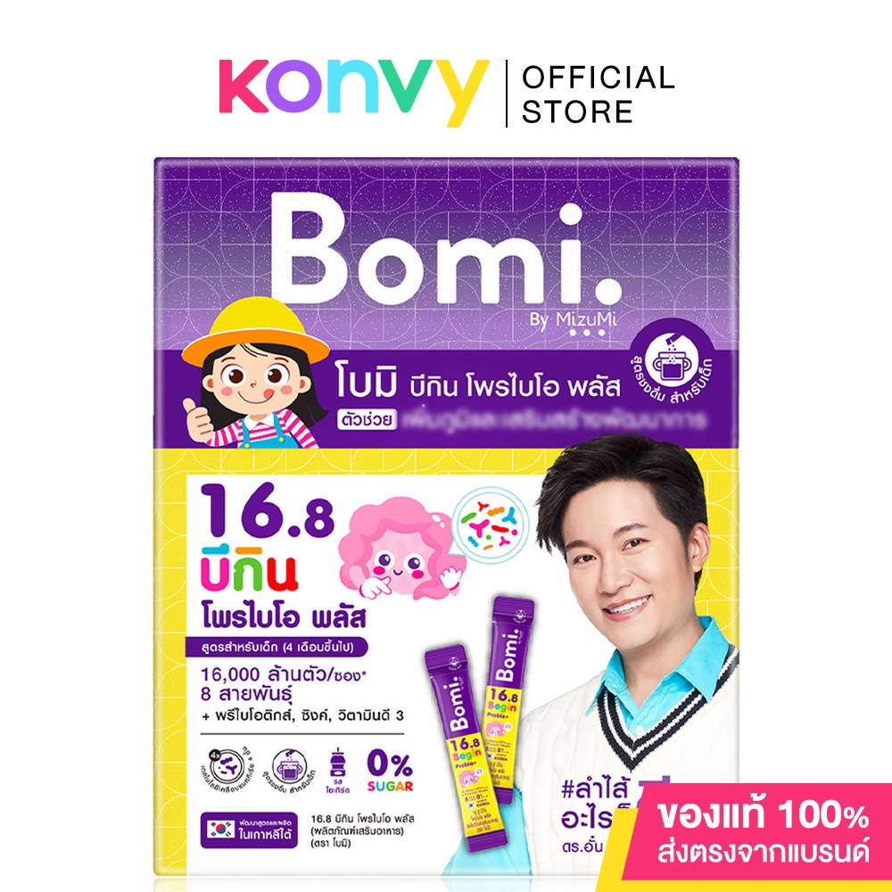 Cr.facebook.com/bomibymizumiMizumi Bomi 16.8 Begin Probio+ [2g x 14 Sachet] ผลิตภัณฑ์เสริมอาหารโพรไบโอติกส์สำหรับเด็ก (4 เดือนขึ้นไป) ที่มีจุลินทรีย์ 16 พันล้านตัว 8 สายพันธุ์นำเข้าจากประเทศเกาหลีใต้ รสโยเกิร์ต ดื่มง่าย