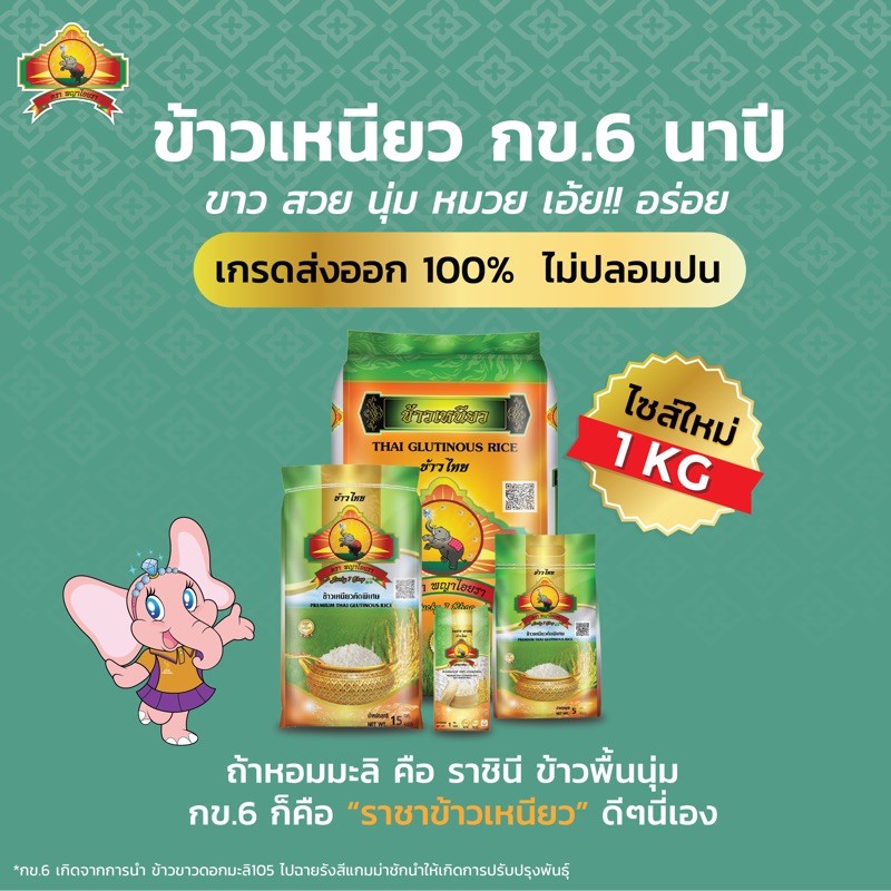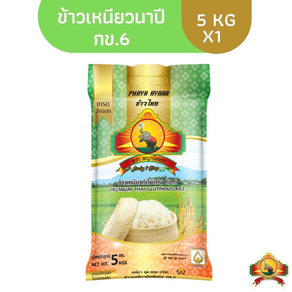 ข้าวเหนียวนาปี กข.6 100% ตราพญาไอยรา ชั้นพิเศษเกรดส่งออก 5KG จำนวน 1 ถุง