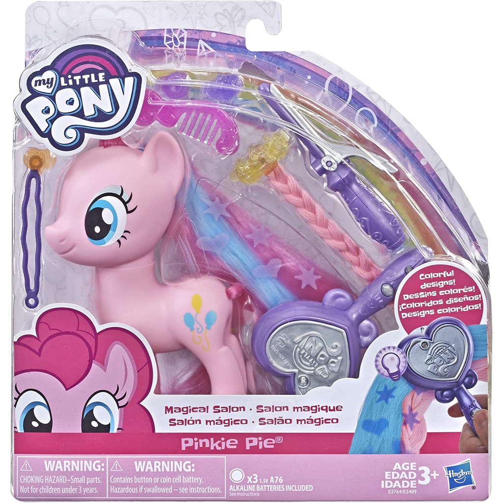 Hair accessories: Pinkie Pie pony has pink hair with beautiful blue highlights. She comes with a clip-in hair extension so kids can give Pinkie Pie a long, multicolored mane. Kids can imagine giving Pinkie Pie a new hairstyle at a magical salon. Brush long, smooth hair with the included comb and curl hair with the curling iron attachment. Kids can also style the Pinkie Pie toys' hair in different ways using the hair bow tool and 2 hair accessories.